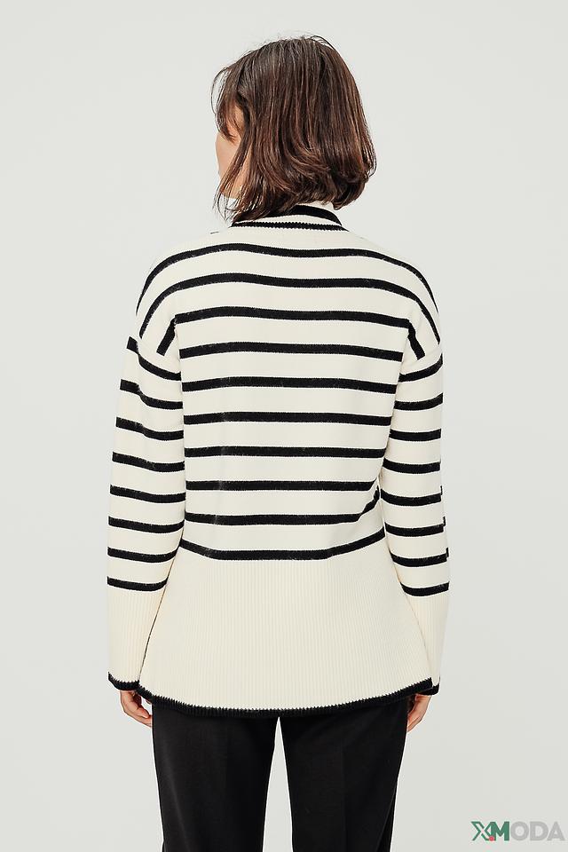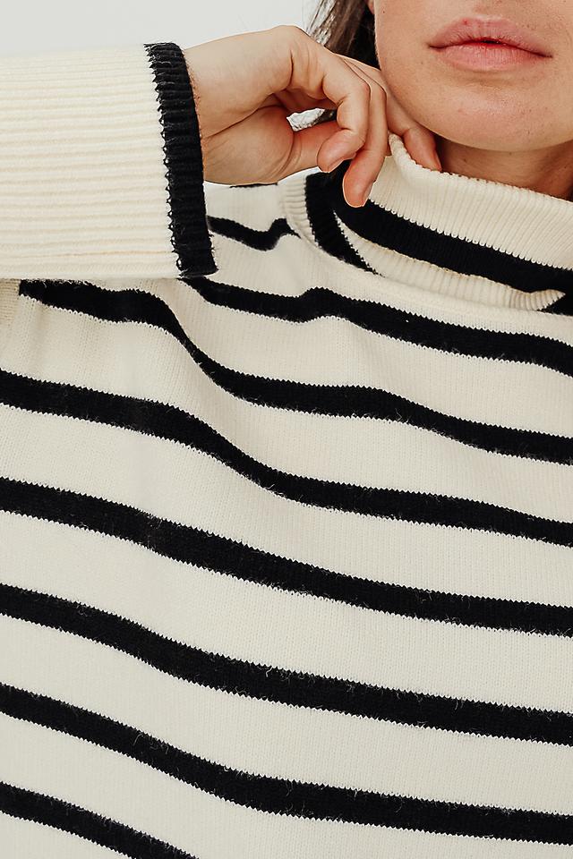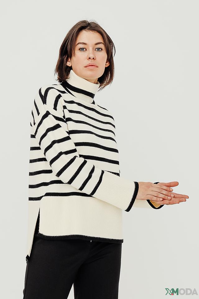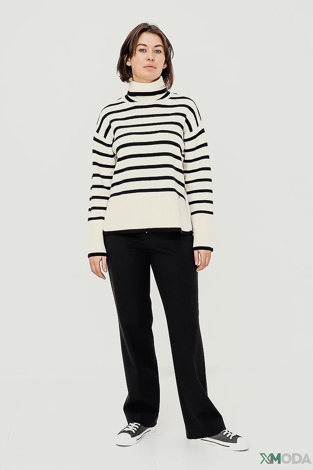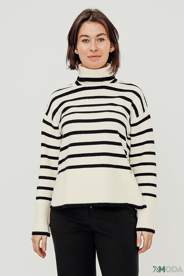 Эта водолазка от Apart станет незаменимой частью вашего гардероба. Она выполнена в классическом стиле с полосатым узором, сочетающим кремовый и чёрный цвета.