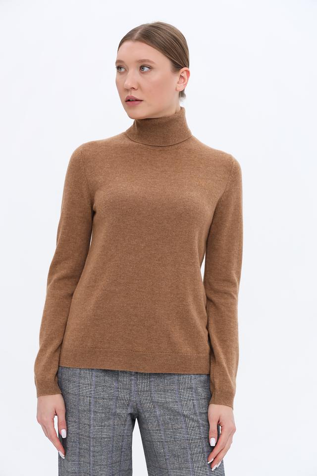 Водолазка имеет классический крой, который подчеркивает фигуру, не сковывая движений. Коричневый цвет придает изделию элегантность и универсальность, позволяя легко сочетать его с различными элементами гардероба.