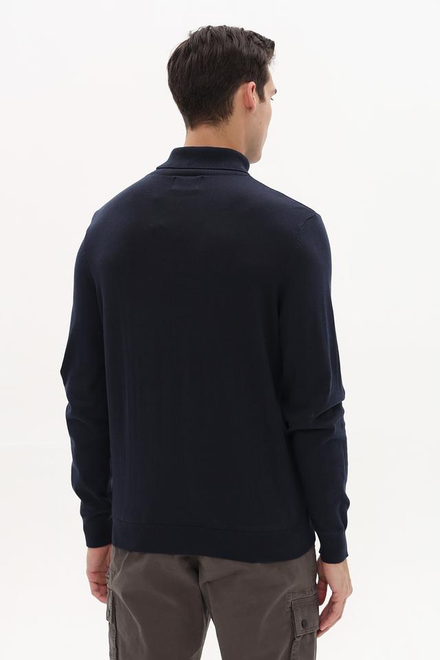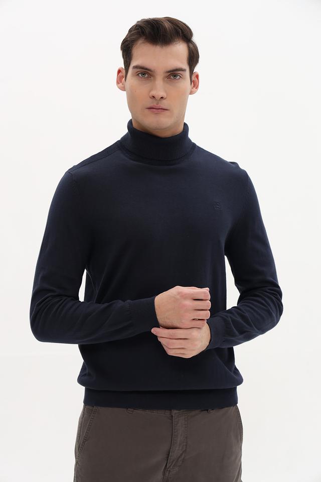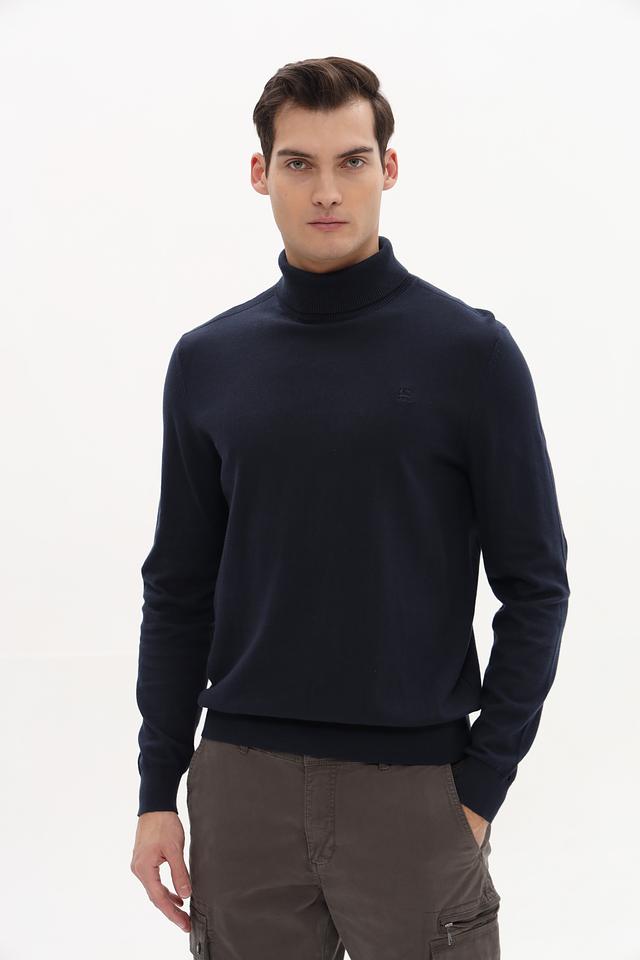 Водолазка имеет классический крой, который подходит для большинства типов фигуры. Тёмно-синий цвет делает её универсальной и легко сочетаемой с другими элементами гардероба. Небольшой логотип бренда на груди добавляет изделию элегантности.