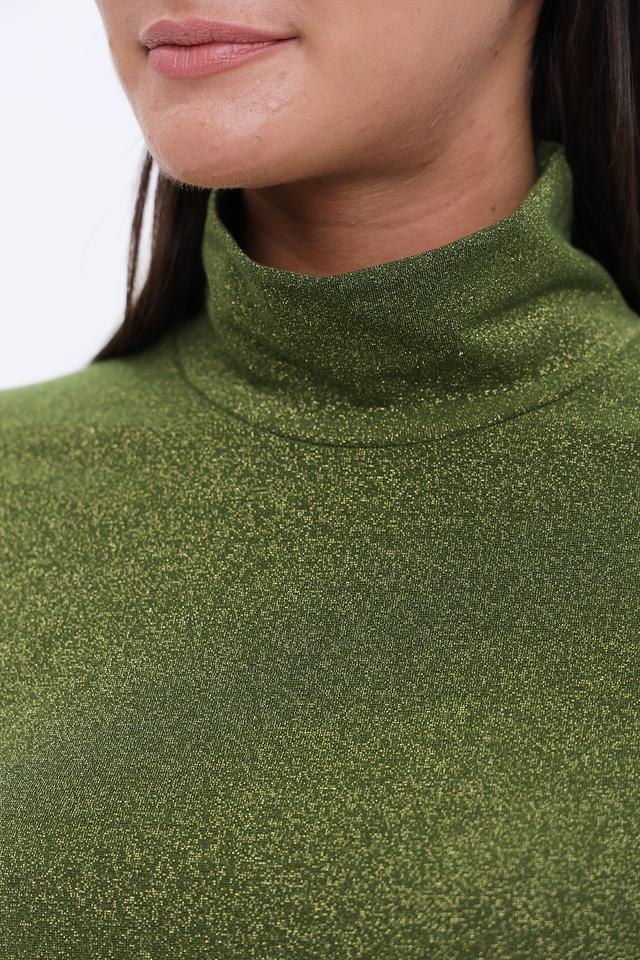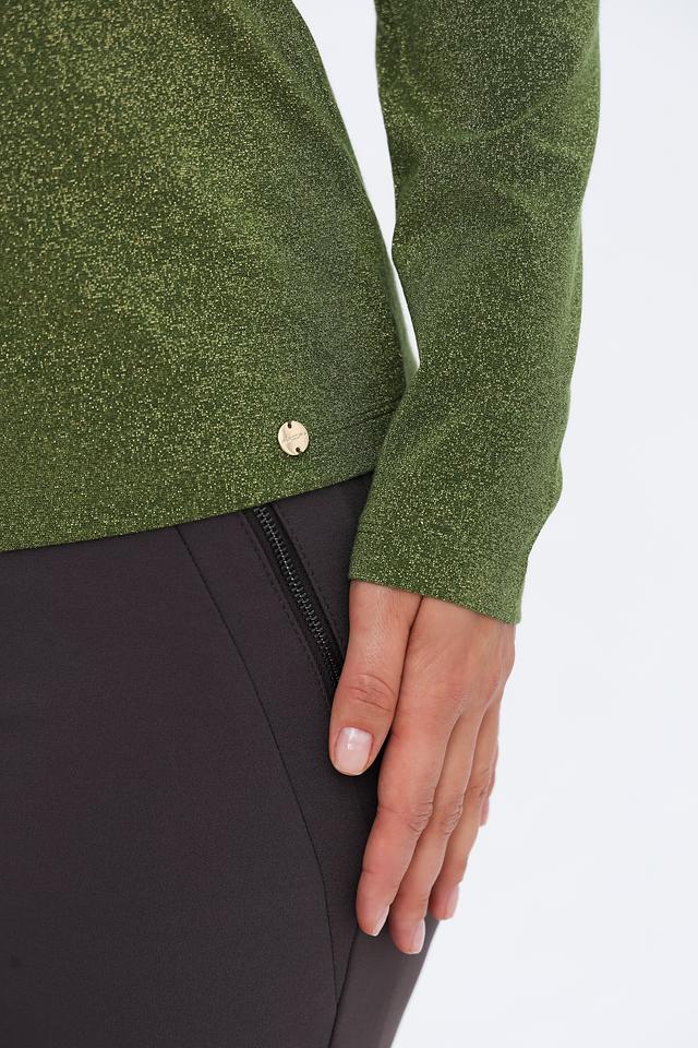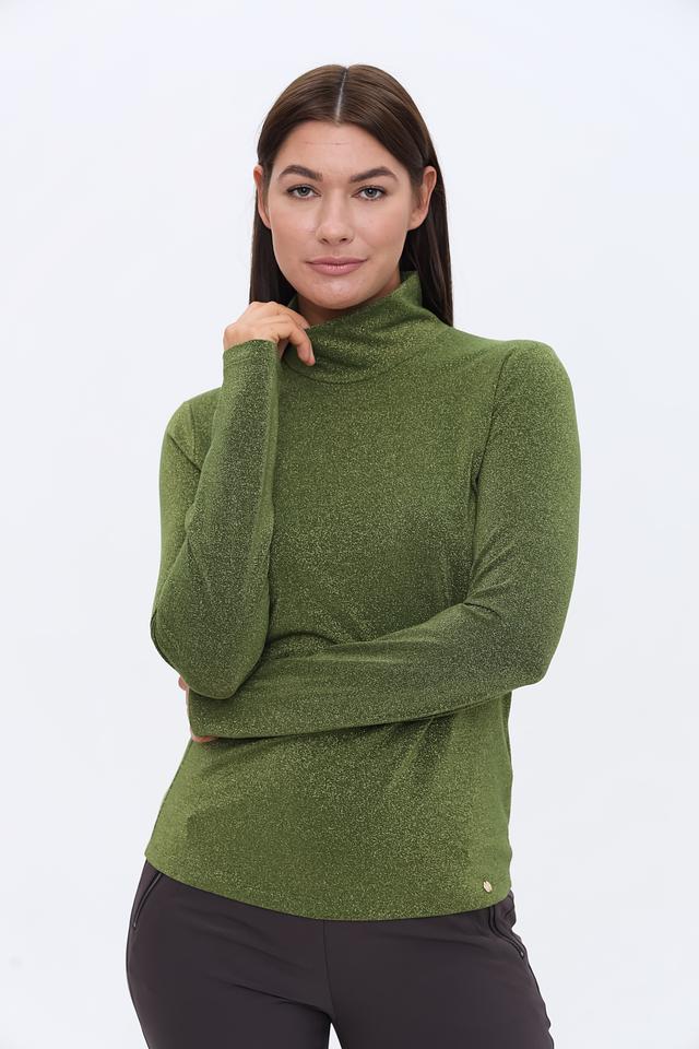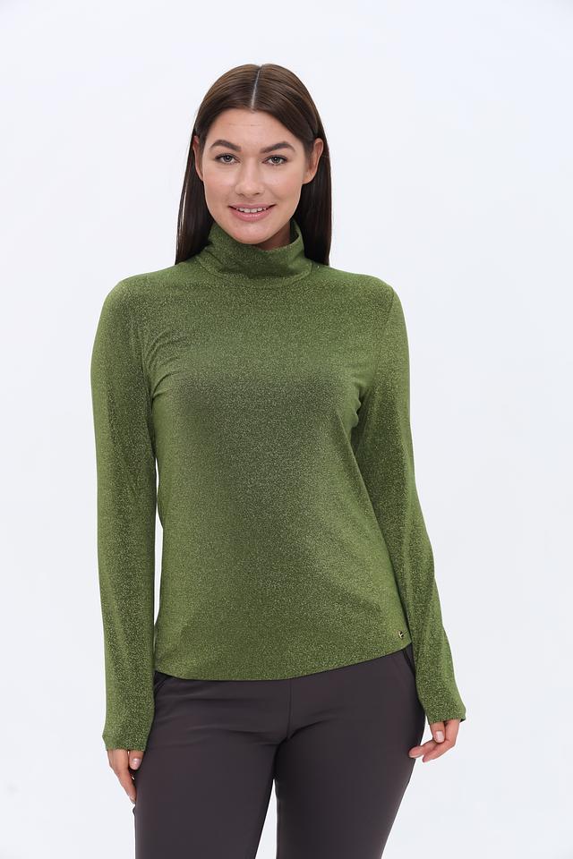 Водолазка Marc Cain оливкового цвета с деликатным блеском станет стильным дополнением к вашему гардеробу. Изготовлена из мягкого и приятного к телу трикотажа, обеспечивающего комфорт в течение дня. Модель отличается облегающим силуэтом и высоким воротом. Состав: полиэстер 62%, металлизир. волокно 17%, полиамид 14%, эластан 7%