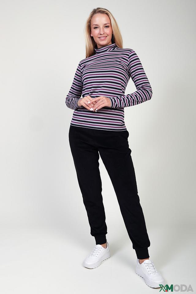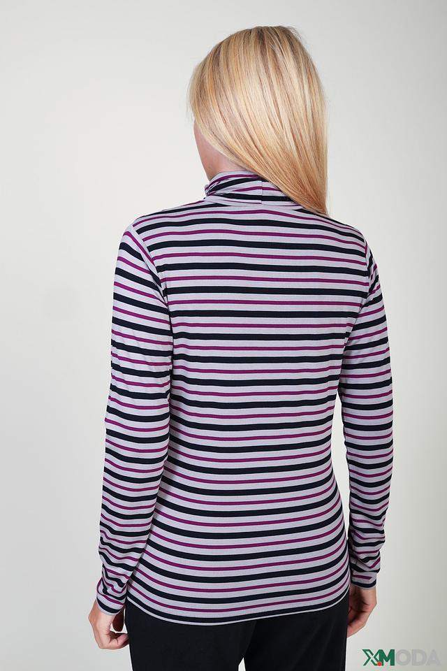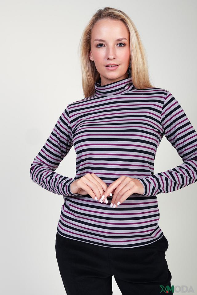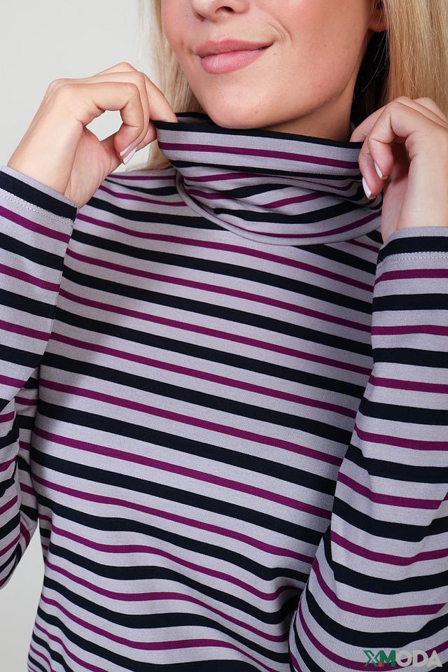 Модель имеет классический приталенный силуэт и высокий воротник-стойку. Особенностью данной водолазки является горизонтальная полоска, сочетающая в себе оттенки сиреневого, серого и чёрного. Такой рисунок визуально освежает образ и делает его более интересным.