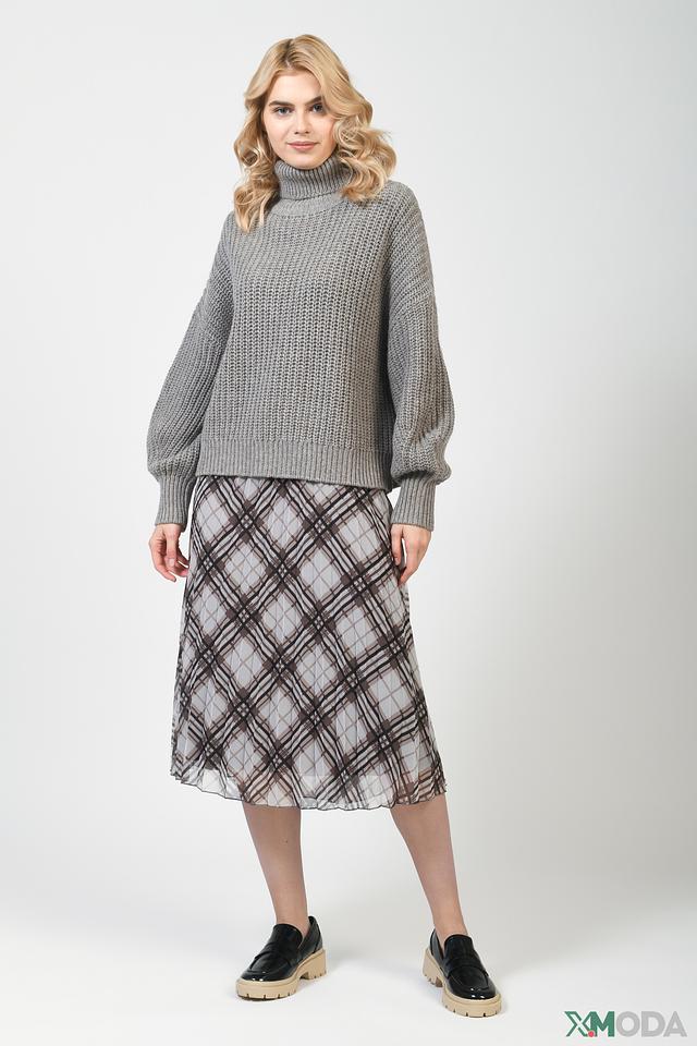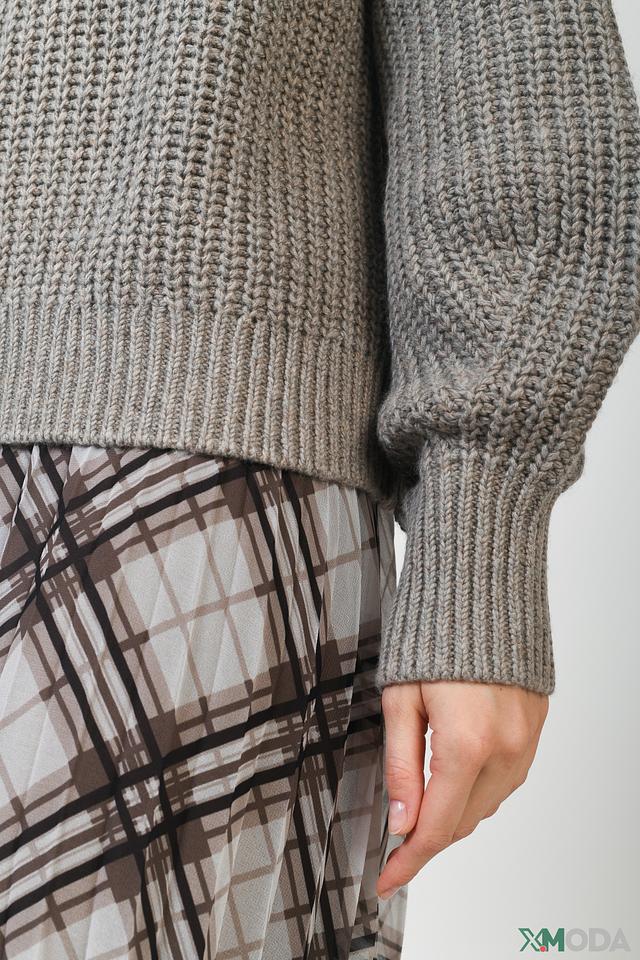 Свитер имеет свободный крой, который не сковывает движений, а рукава-фонарики добавляют образу оригинальности. Высокий воротник защищает от ветра и холода, а крупная вязка придает изделию текстуру и объем.