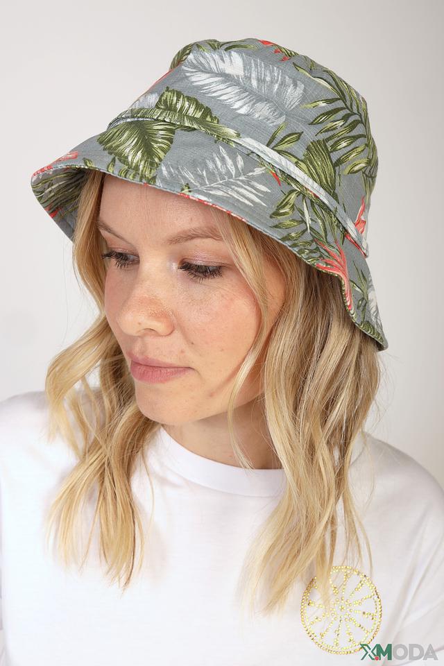 Шляпа имеет оригинальный дизайн с ярким тропическим принтом, который добавит вашему образу летнее настроение. Серый фон оттеняет сочные красные цветы и пышную зелень листьев, создавая гармоничное сочетание цветов.
