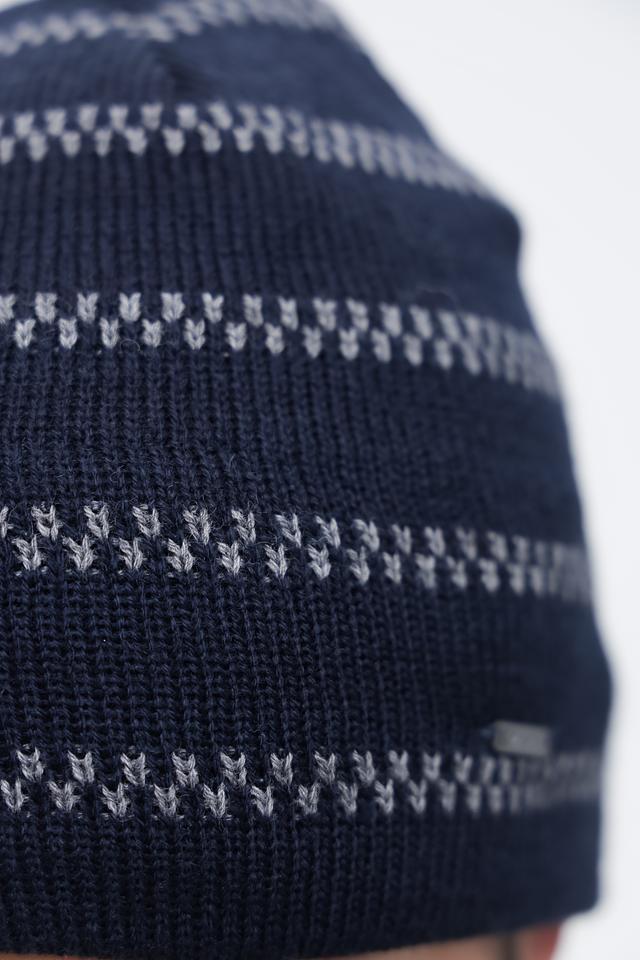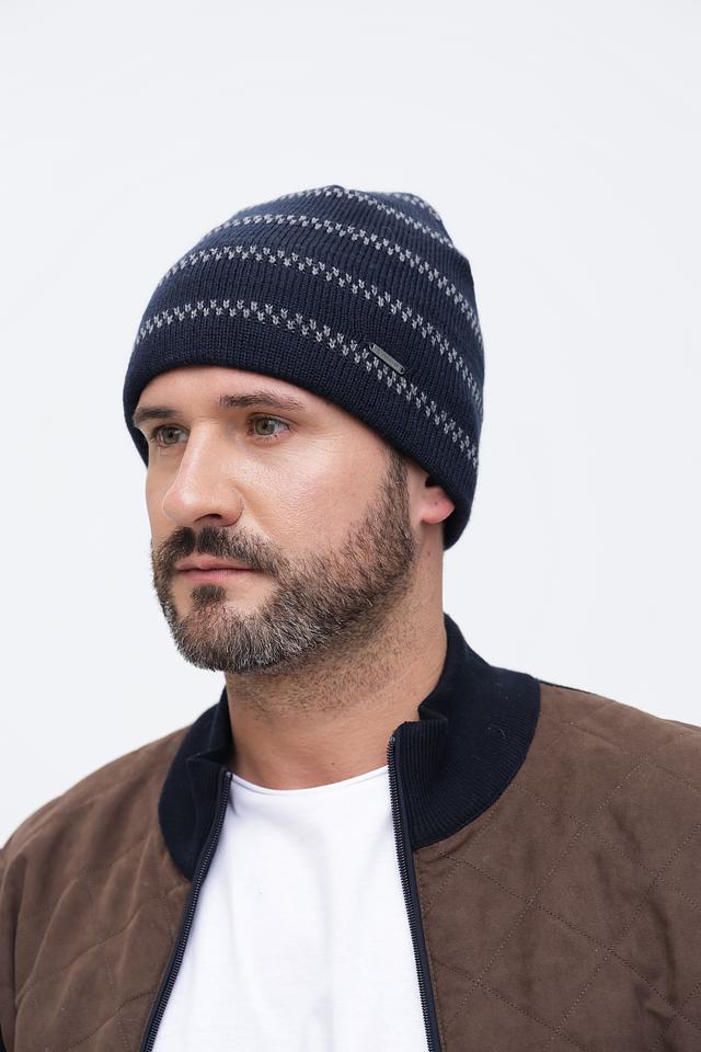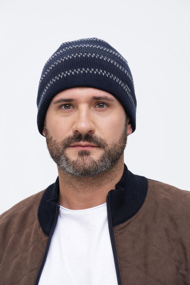 Шапка выполнена в насыщенном синем цвете и имеет оригинальный жаккардовый узор, который придает ей стильный и современный вид. Узор состоит из чередующихся полос и геометрических фигур, выполненных в светло-серых тонах.