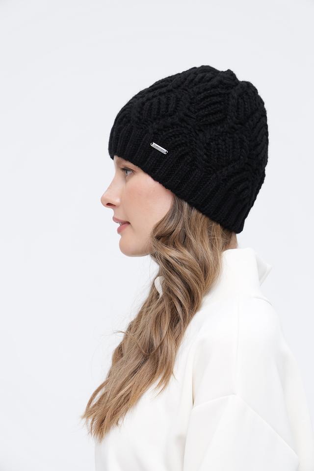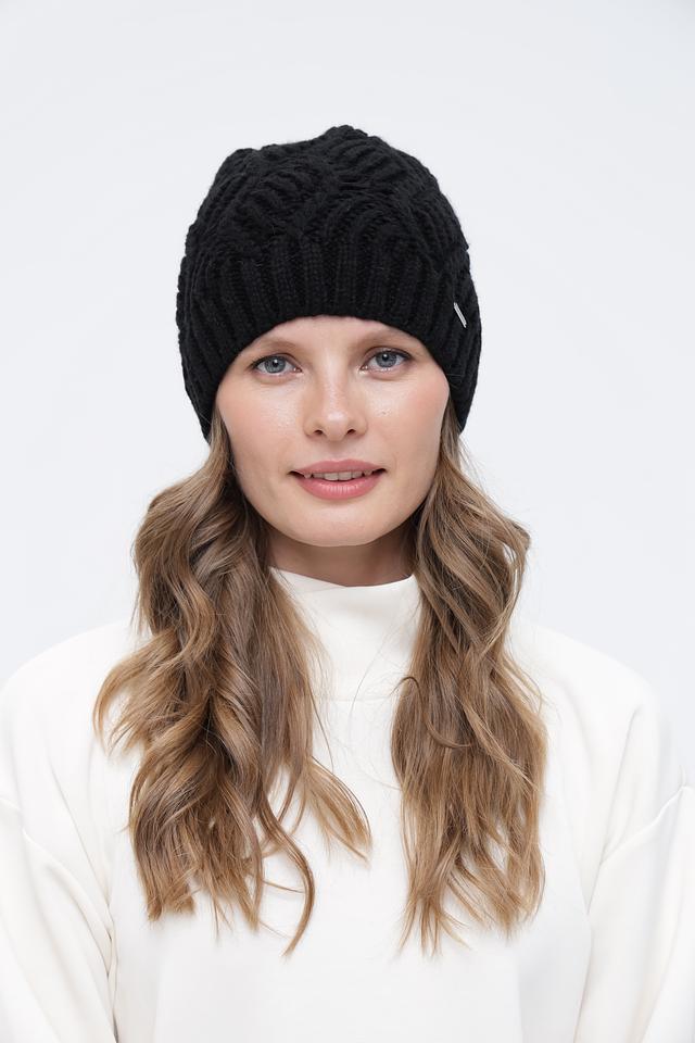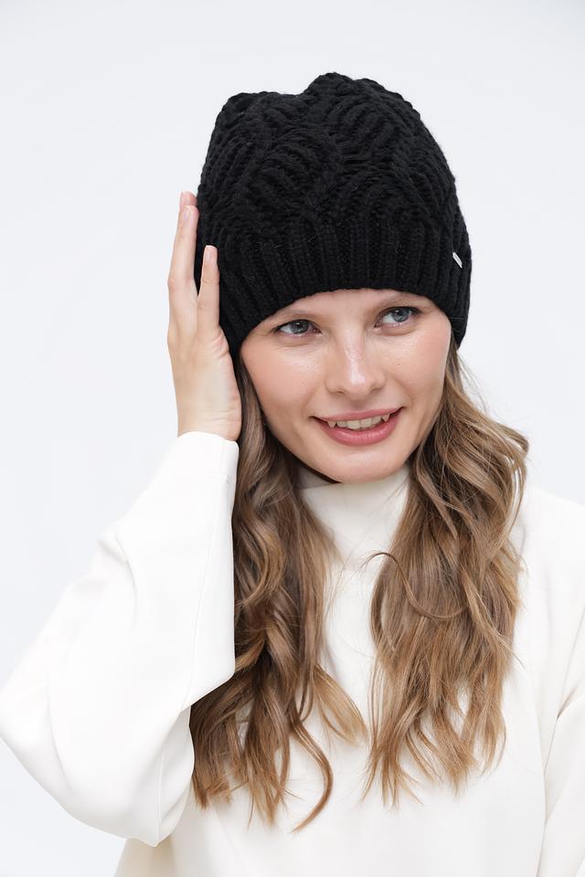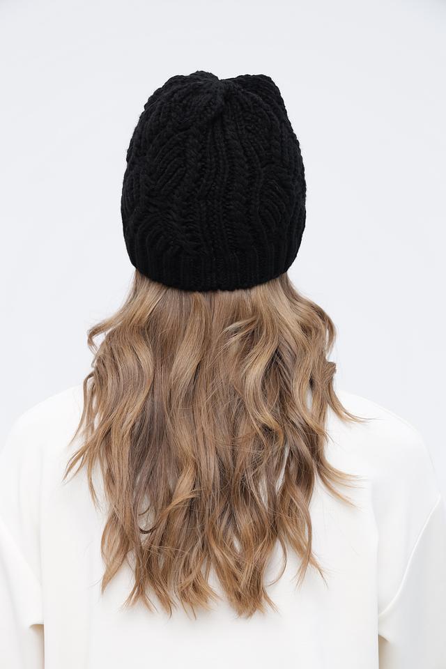 Чёрный цвет делает эту шапку универсальной и легко сочетаемой с любой верхней одеждой. Объемный узор из кос придает аксессуару оригинальность и выразительность.