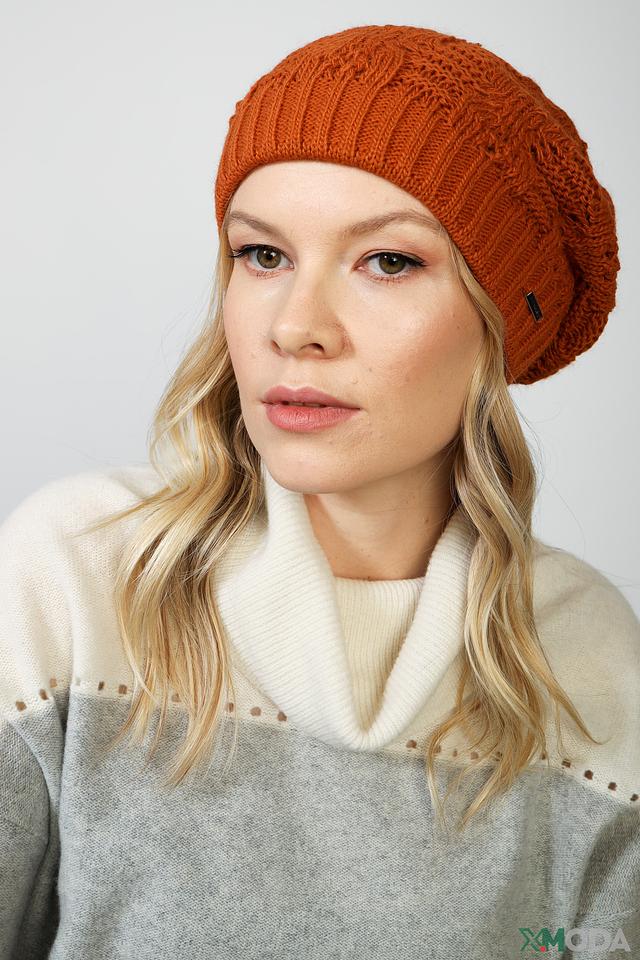 Шапка имеет рыжий цвет и выполнена объемной вязкой с выразительным узором. Такая текстура не только привлекает внимание, но и хорошо сохраняет тепло. Удобная посадка и мягкие материалы делают эту шапку комфортной в носке.