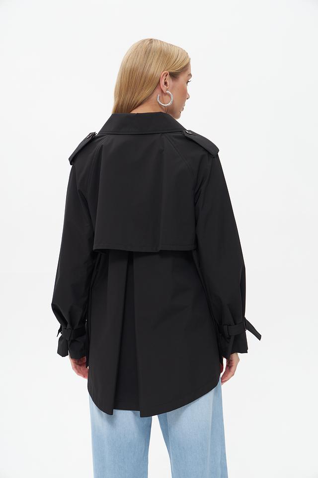 Плащ имеет двубортную застёжку на пуговицы, что придает ему элегантный вид. Пояс позволяет подчеркнуть талию и создать более женственный силуэт. Широкие рукава и свободный крой обеспечивают комфорт и свободу движений.