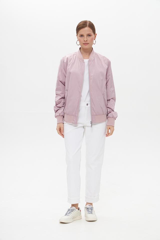 Эта женская куртка от White Label выполнена в нежном пудрово-розовом цвете. Модель представляет собой классический бомбер с застежкой на молнии, что обеспечивает удобство и практичность.