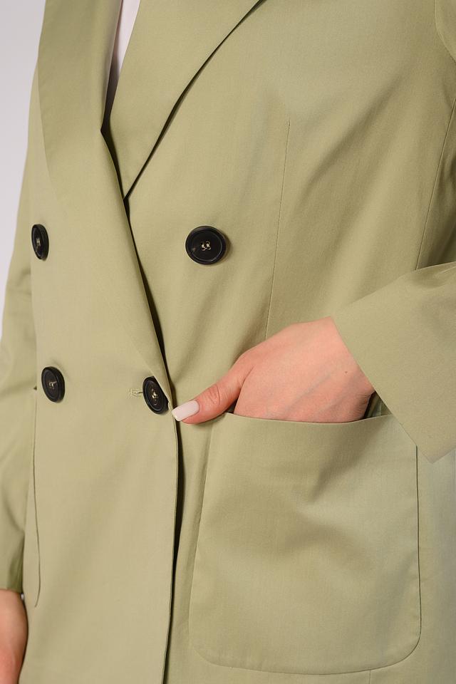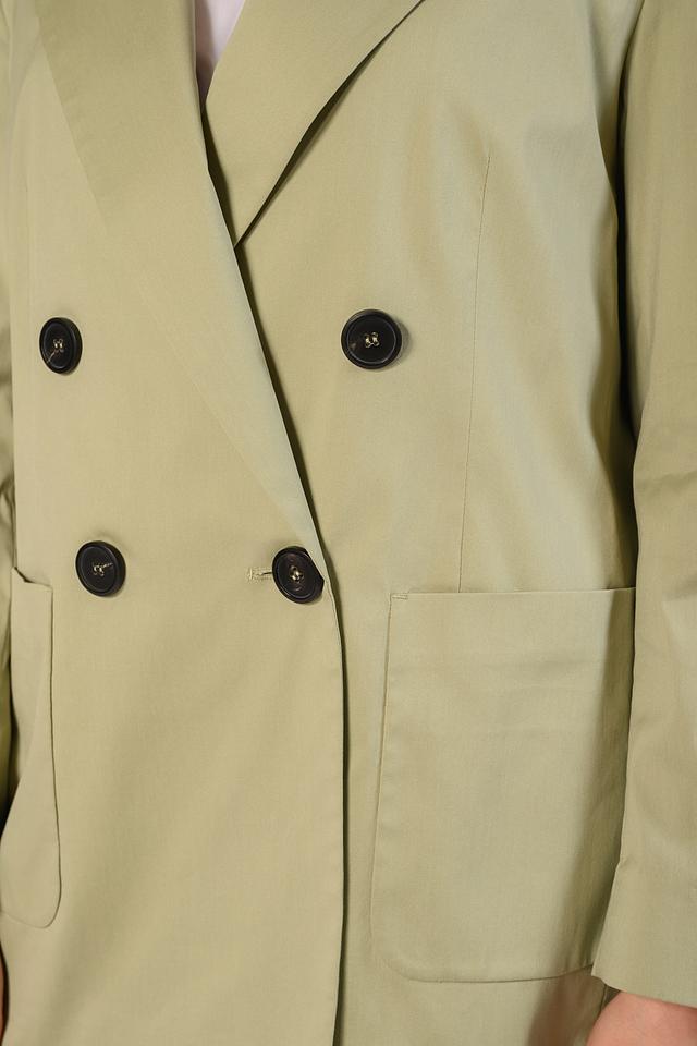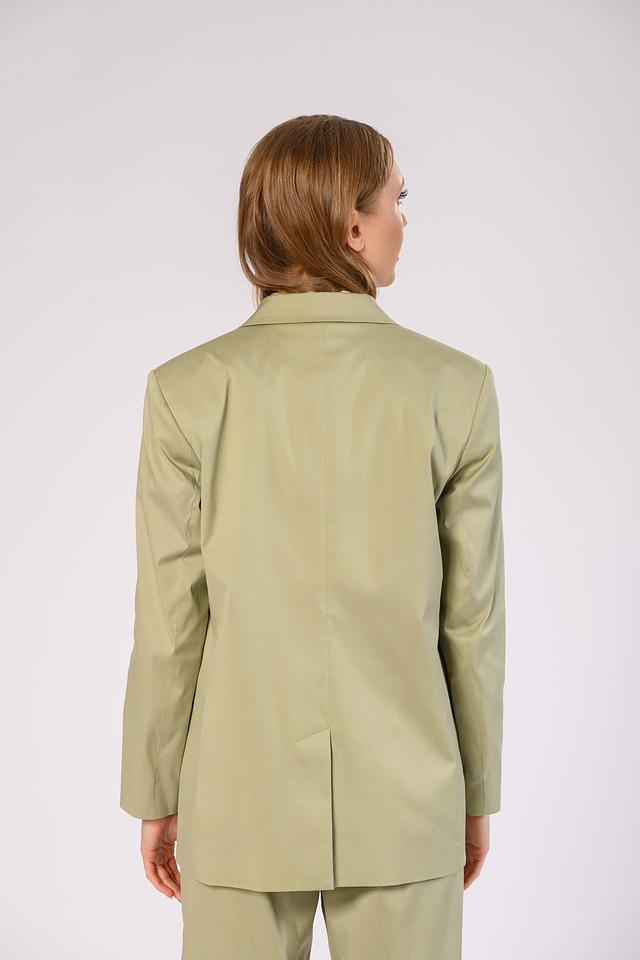 Жакет имеет оверсайз крой, который обеспечивает комфортную посадку и свободу движений. Двубортная застежка на пуговицах добавляет модели элегантности и строгости. Классический лацкан подчеркивает линии плеч.