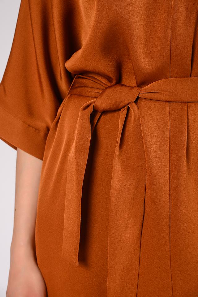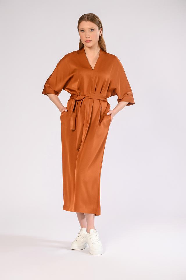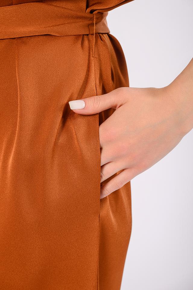 Цвет платья – насыщенный медный, который отлично подойдет для создания ярких и стильных образов. Платье имеет боковые карманы, что делает его более практичным и удобным в повседневной носке. Состав ткани: 77% триацетат, 23% полиэстер.