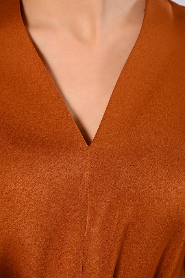 Платье Windsor цвета медный — это элегантная модель с V-образным вырезом и запахом. Платье выполнено из струящейся ткани и дополнено поясом, который подчеркивает талию и создает женственный силуэт. Состав: триацетат 77%, полиэстер 23%