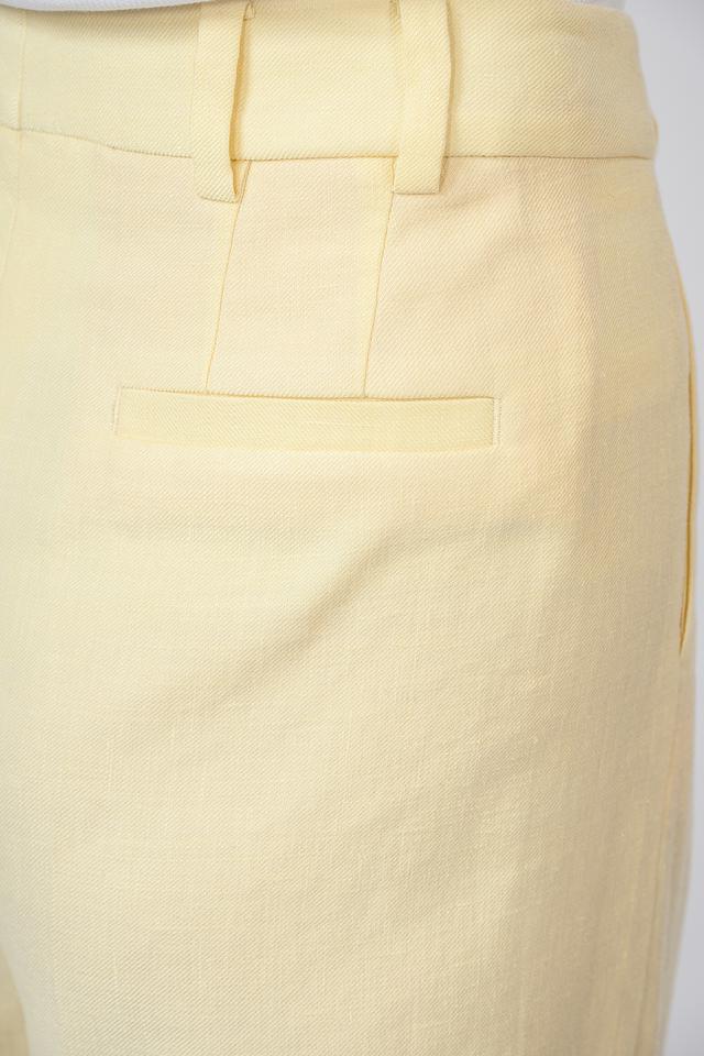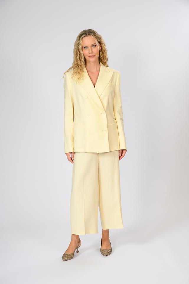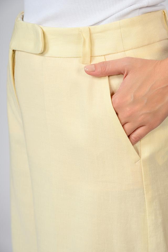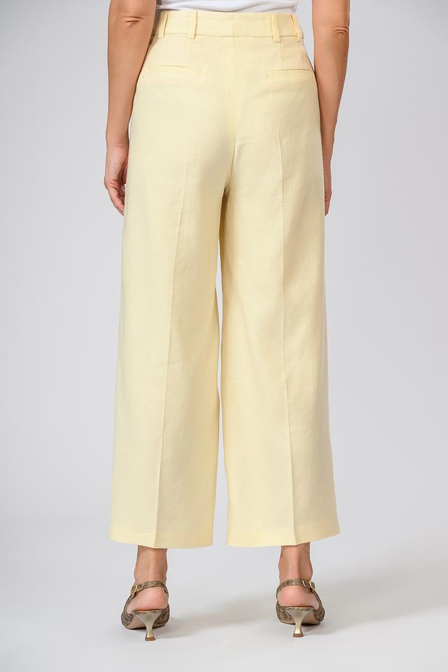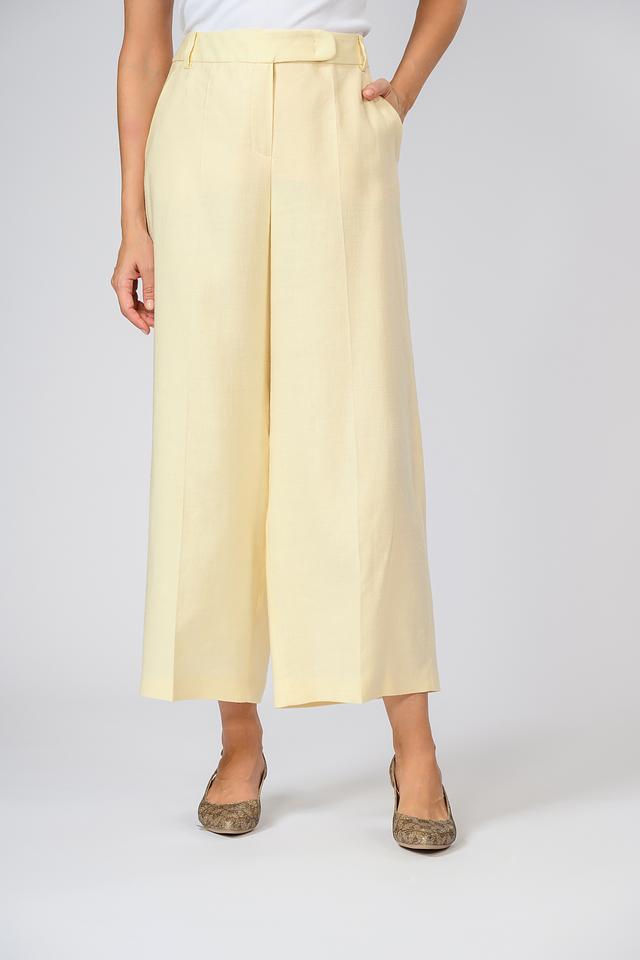 Женские брюки Windsor нежно-жёлтого цвета, выполнены из льна с добавлением вискозы и эластана. Модель палаццо отличается свободным кроем и высокой посадкой. Состав: лен 58%, луоселл 39%, эластан 3%