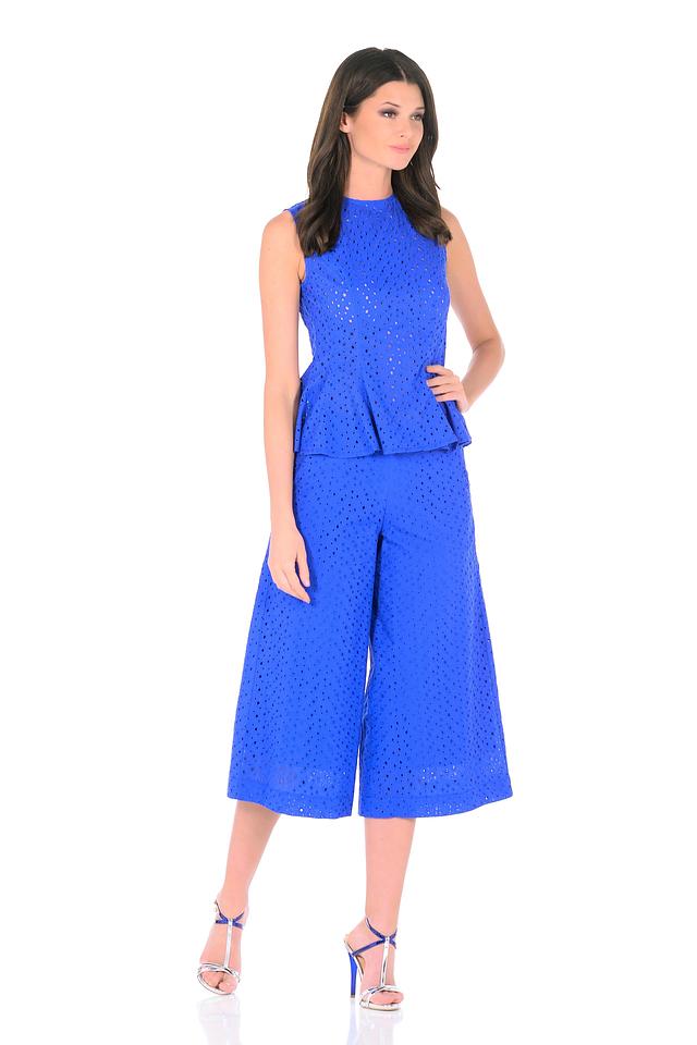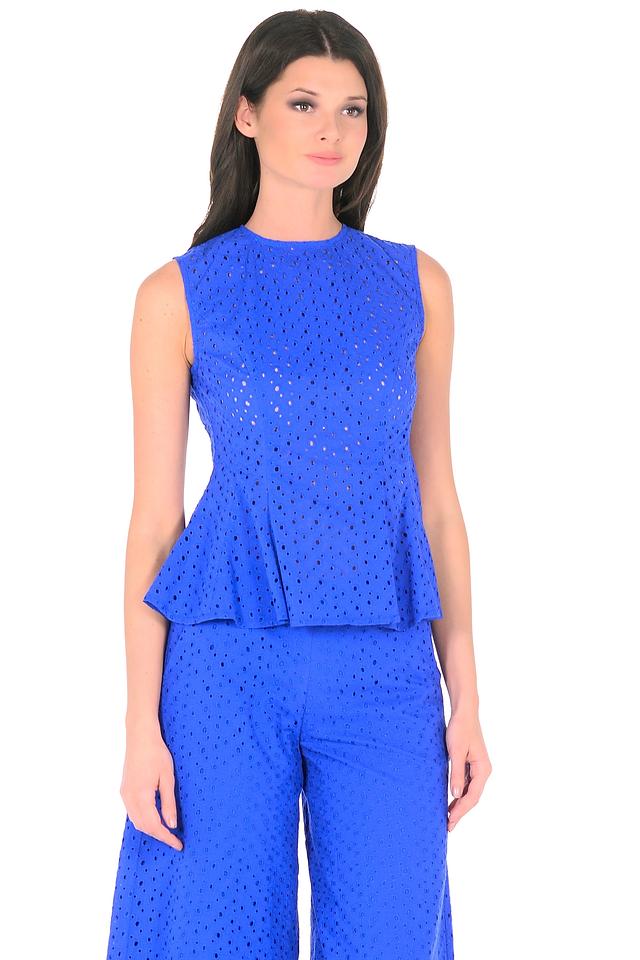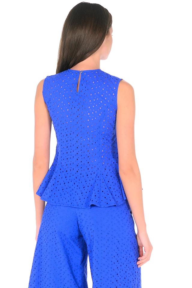 Синяя блуза XARIZMAS из 100% хлопка с ажурной вышивкой и пеплумом. Модель имеет круглый вырез горловины и короткие рукава, идеально подходит для создания летних образов. Состав: хлопок 100%