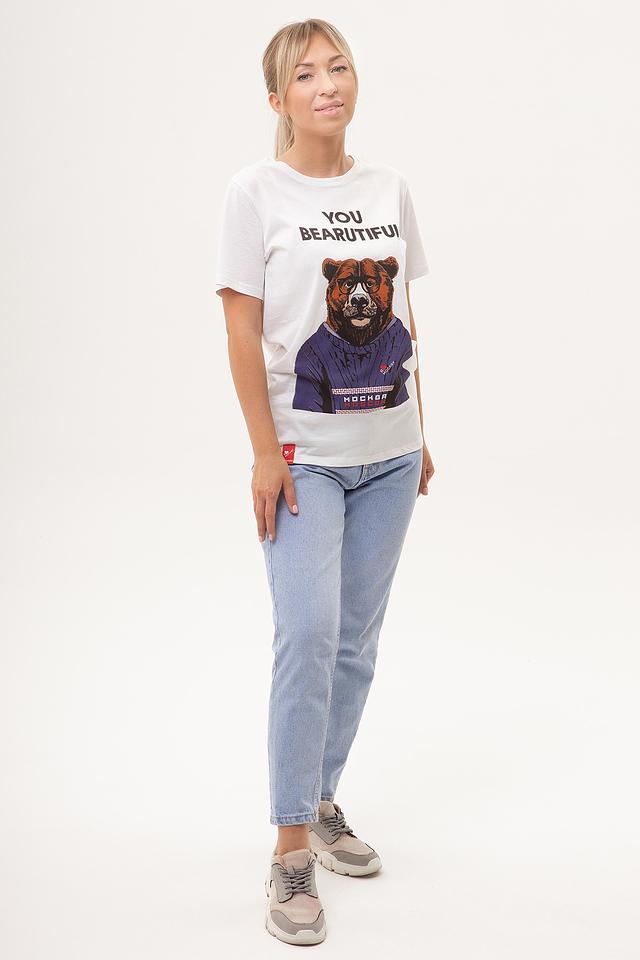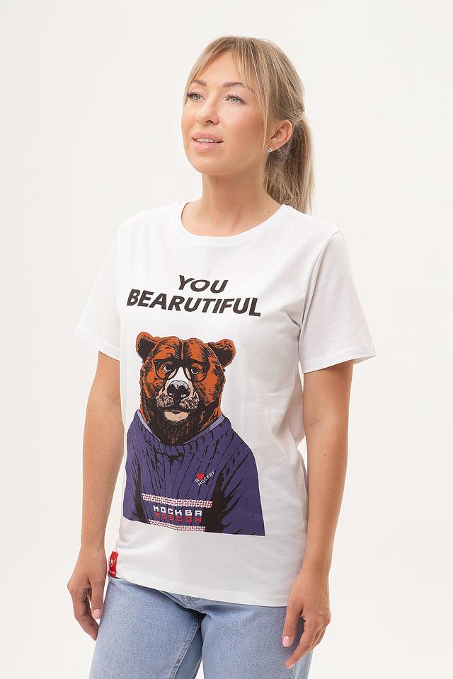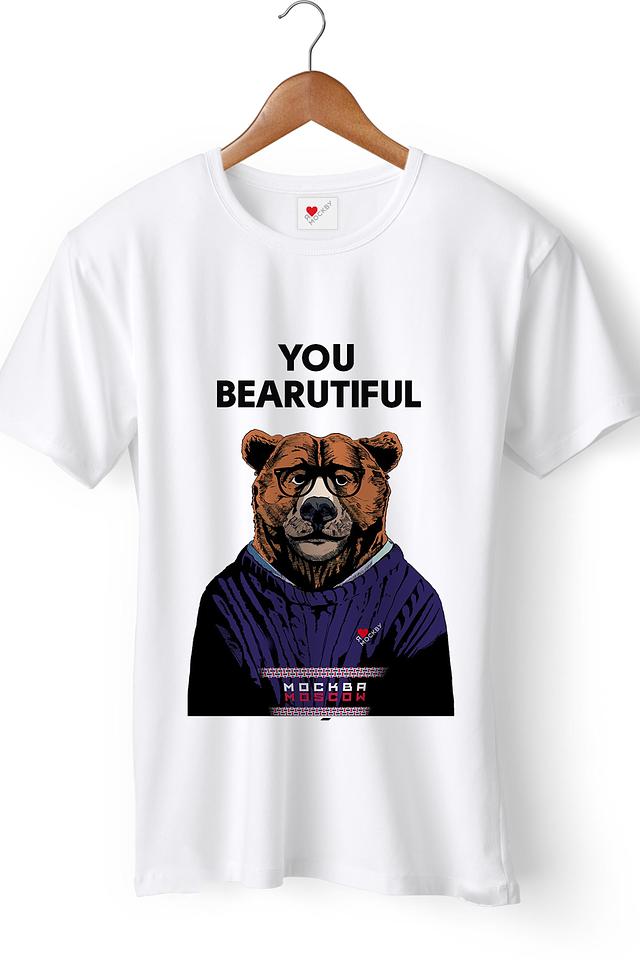 Основным элементом дизайна является яркий принт с изображением медведя, одетого в синий спортивный костюм, и надписью "YOU BEARAUTIFUL". Этот оригинальный рисунок придаёт футболке индивидуальность и выразительность.