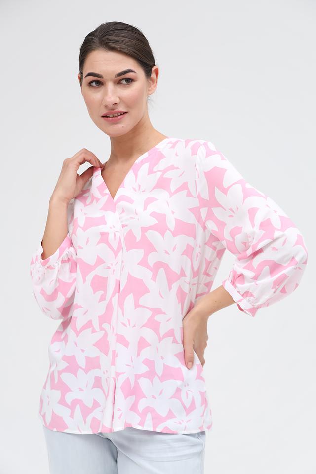 Блуза украшена ярким цветочным принтом на розовом фоне, который делает её особенно привлекательной и подходящей для летнего сезона. Она прекрасно сочетается с джинсами, брюками или юбками, позволяя создавать разнообразные стильные образы.