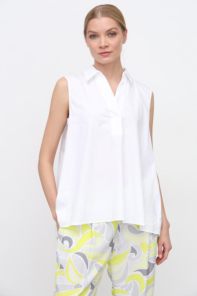 Топ имеет классический крой без рукавов и стильный воротник, который придаёт образу элегантность. Прямой силуэт топа позволяет сочетать его с различными предметами гардероба – от классических брюк до джинсов и юбок.