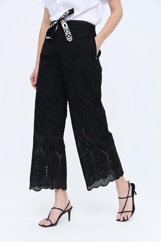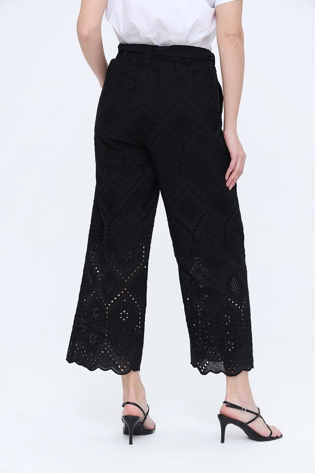 Особенностью модели является ажурный рисунок, который придает брюкам легкость и изысканность. Пояс с геометрическим принтом в чёрно-белой гамме акцентирует талию и добавляет образу оригинальности.