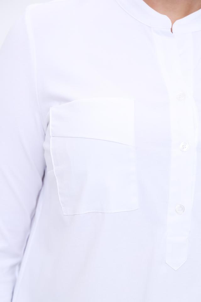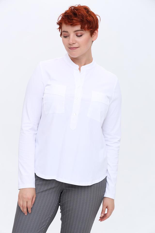 Модель имеет прямой крой, длинные рукава и воротник-стойку с небольшой планкой на пуговицах. На груди расположены два накладных кармана, которые добавляют блузе функциональности и стиля.