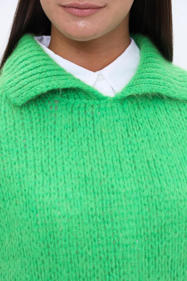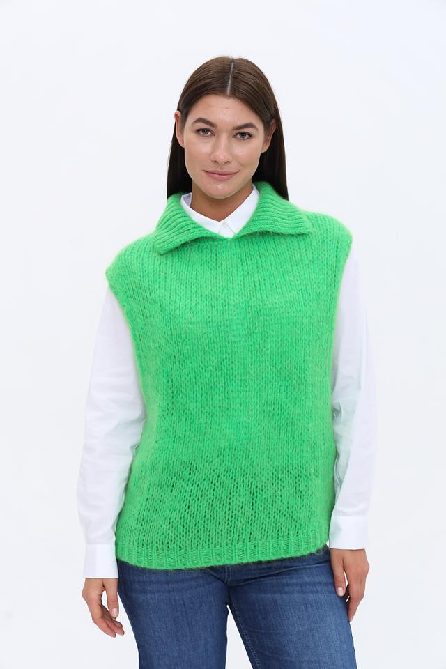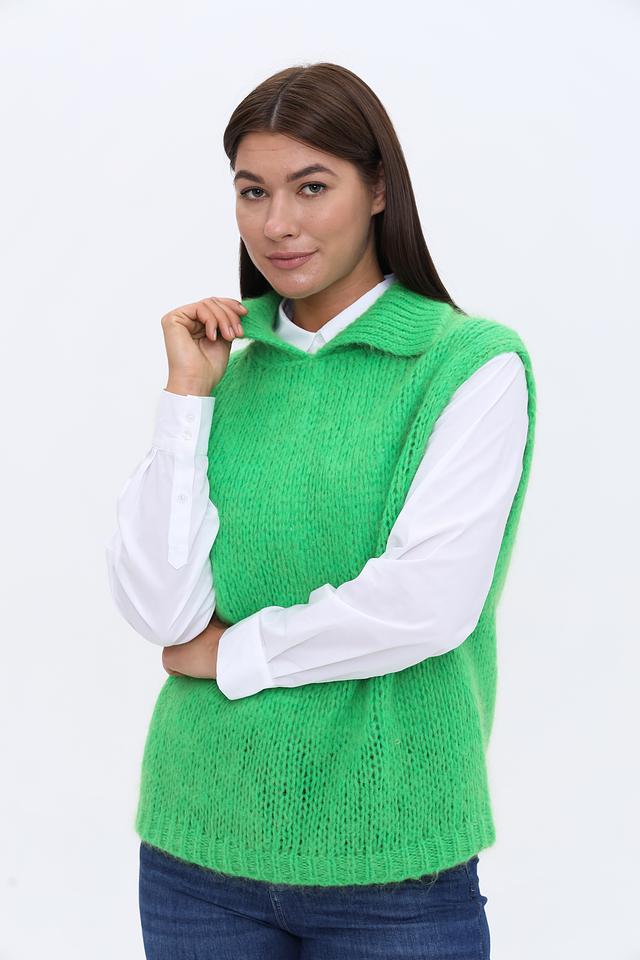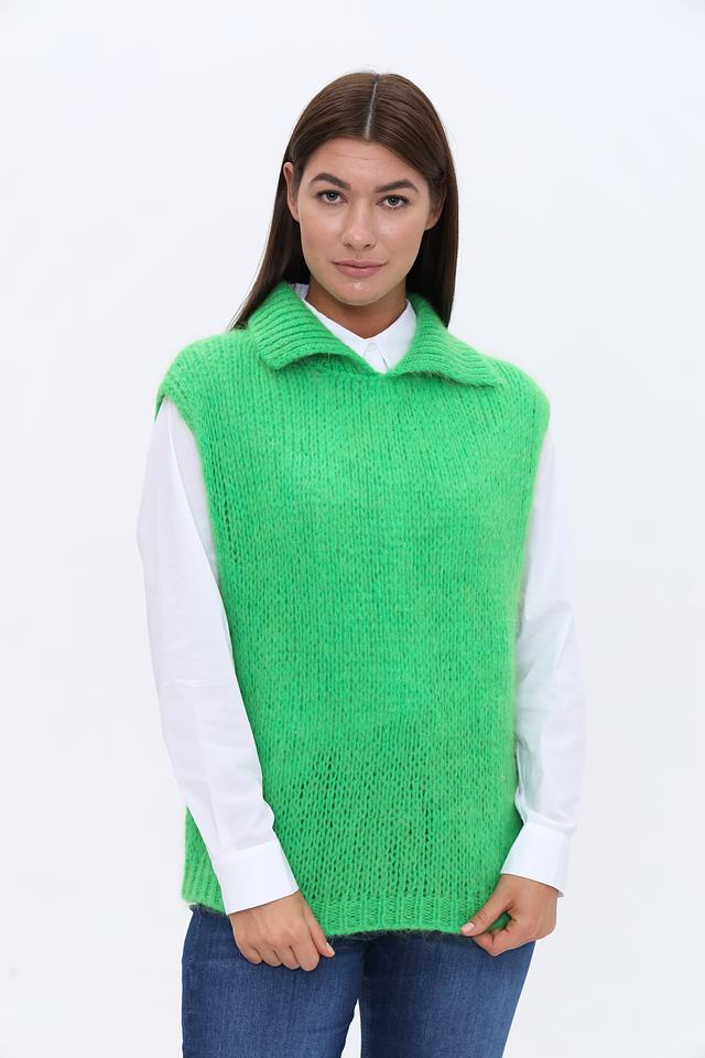 Модель имеет свободный крой и крупную вязку, что делает ее очень уютной и стильной. Воротник-стойка добавляет оригинальности. Жилет прекрасно сочетается с различными элементами гардероба – от классических рубашек до повседневных джинсов.