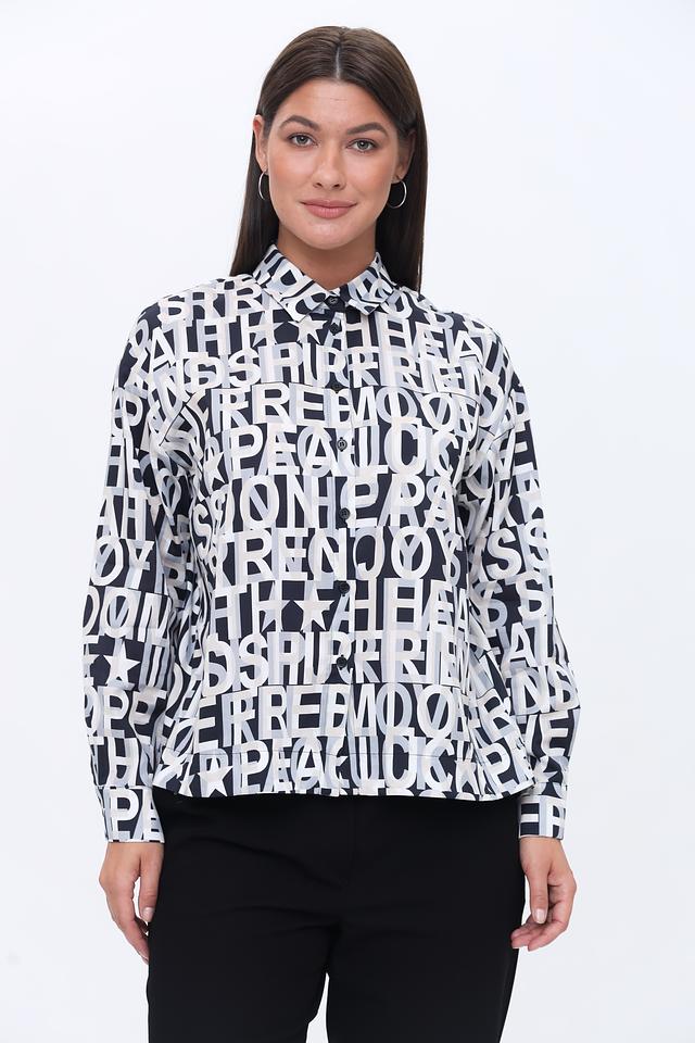Рубашка имеет свободный крой, длинные рукава и воротник-стойку. Её особенностью является яркий принт, состоящий из повторяющихся надписей, выполненных в чёрном цвете на белом фоне. Такой дизайн делает рубашку заметной и стильной.