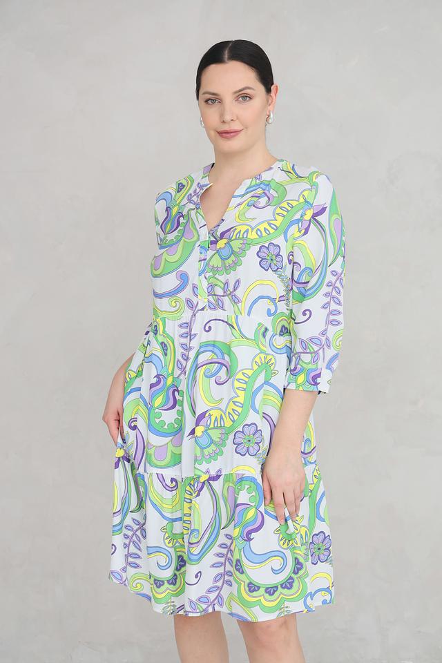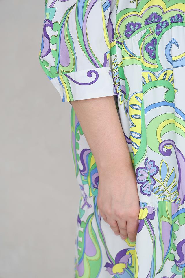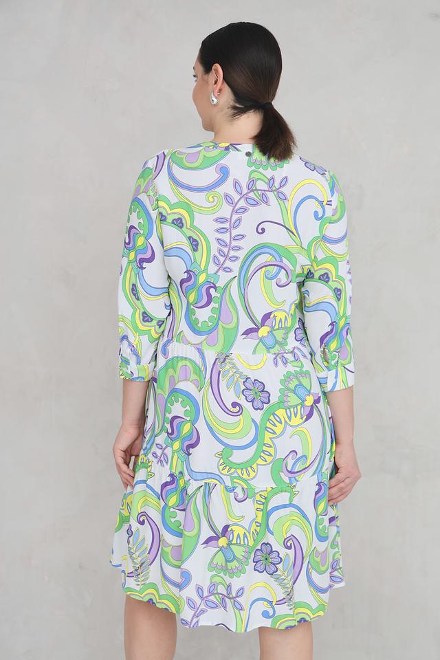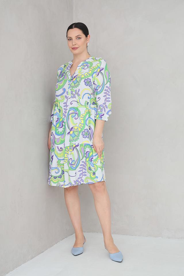 Платье имеет прямой силуэт и длину до колена. V-образный вырез горловины и короткие рукава добавляют образу женственности. Основной цвет платья – белый, а яркий принт с цветами и растительными мотивами делает его запоминающимся и оригинальным.