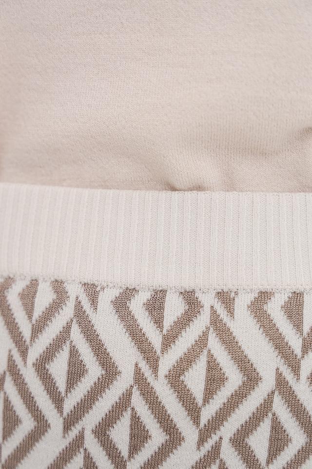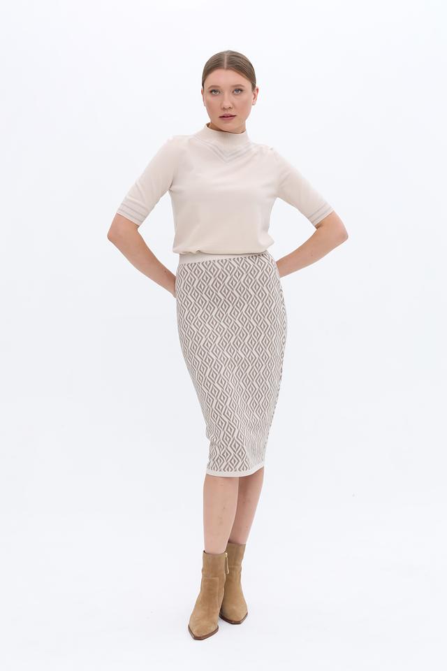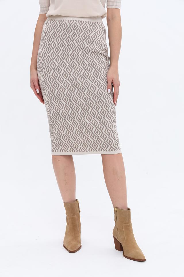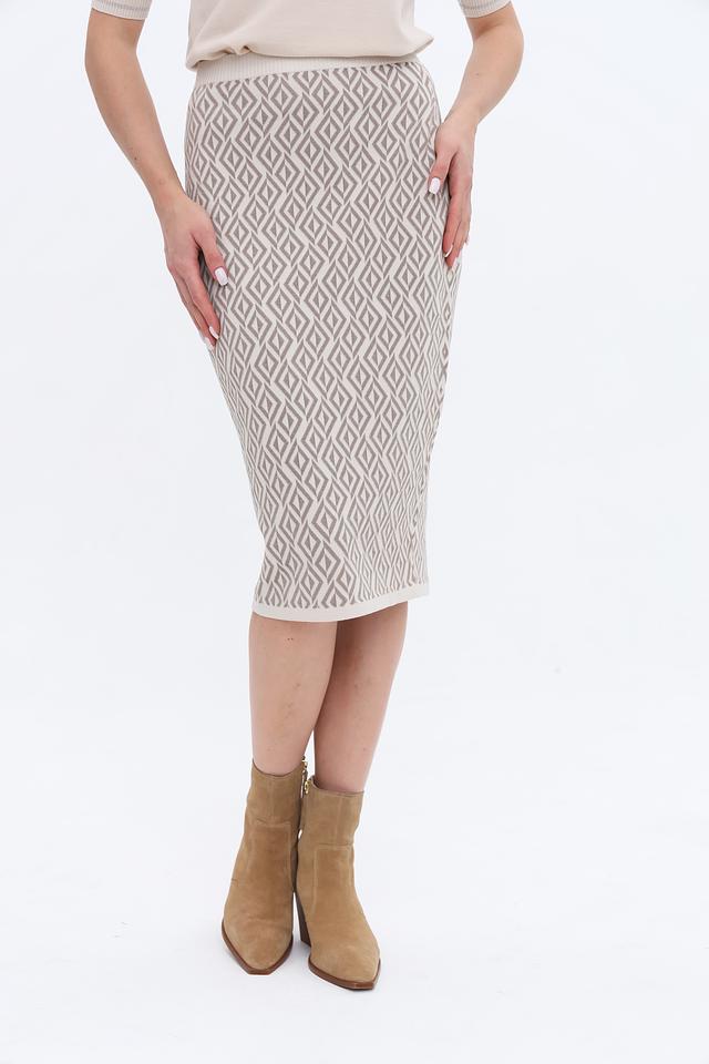 Юбка имеет приталенный силуэт и длину миди, что делает ее универсальной для различных случаев. Особенностью модели является вязаная текстура и оригинальный геометрический узор, выполненный в бежевых и серо-коричневых тонах. Эластичный пояс обеспечивает удобную посадку по фигуре.