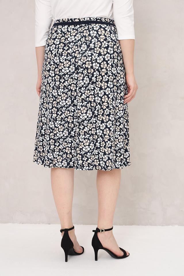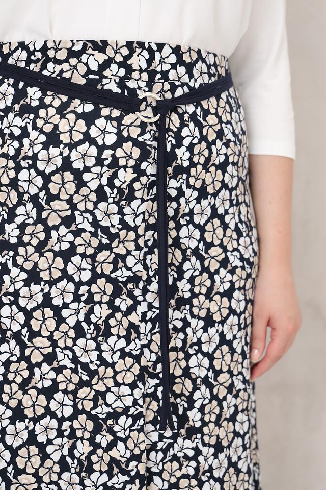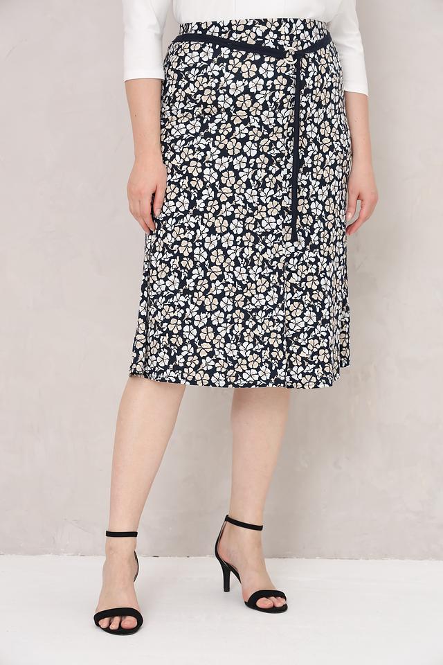 Юбка имеет классическую длину миди и прямой силуэт, который подходит для любой фигуры. Декорирована она мелким цветочным принтом на темно-синем фоне, что придает ей романтичное настроение. Застежка-пояс позволяет регулировать посадку по талии и подчеркивать достоинства силуэта.