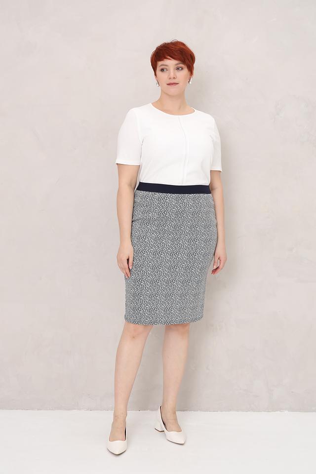 Юбка имеет классический крой – карандаш, который подчеркивает фигуру. Особенностью модели является мелкий клетчатый принт в сочетании серого и тёмно-синего цветов. Эластичный пояс обеспечивает удобную посадку по фигуре.