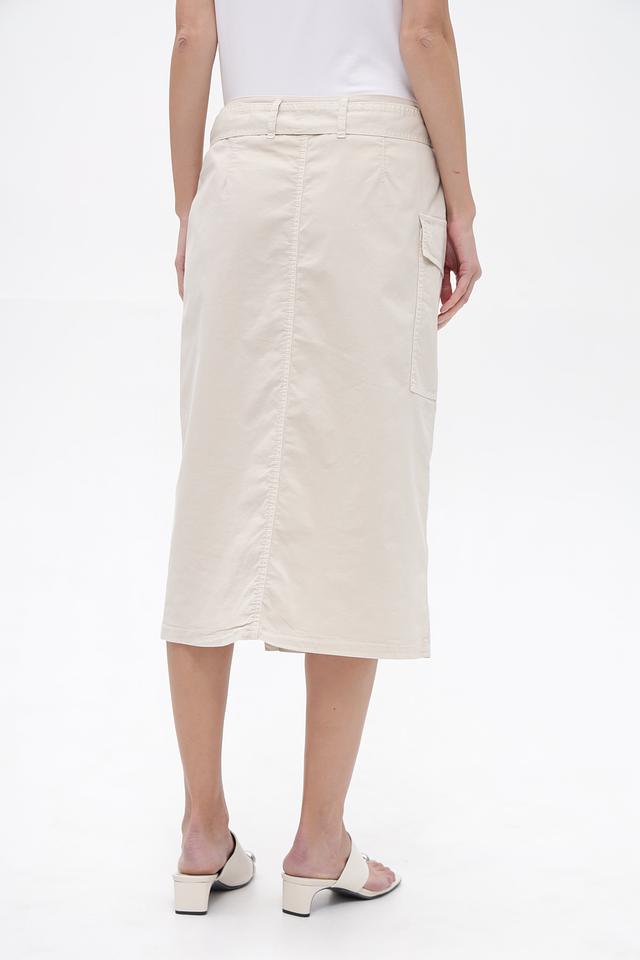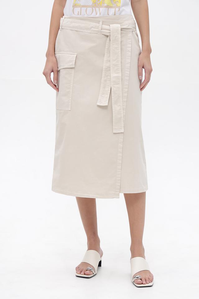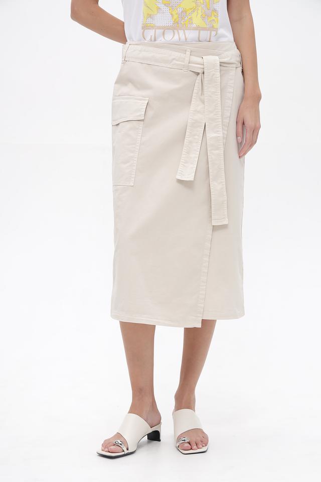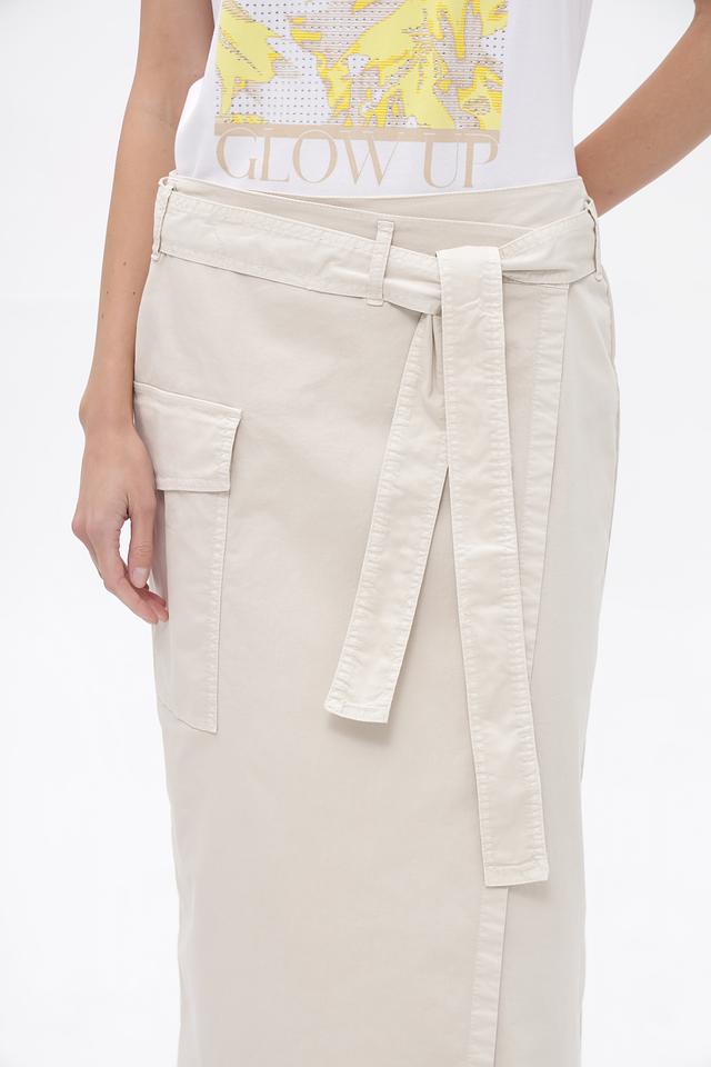 Бежевая юбка Gardeur длиной миди выполнена из хлопка с добавлением эластана. Модель имеет запах, пояс и функциональные карманы. Состав: хлопок 97%, эластан 3%