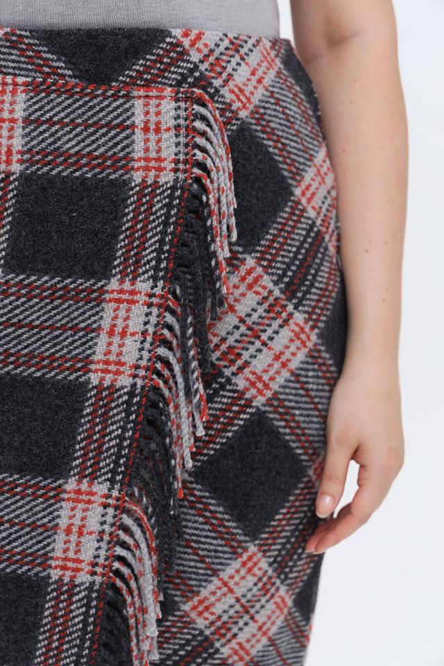 Юбка имеет длину до колена и выполнена из смеси полиэстера и шерсти, что обеспечивает комфорт и тепло в прохладную погоду. Декоративная бахрома по краю придает юбке особый шарм и изысканность.