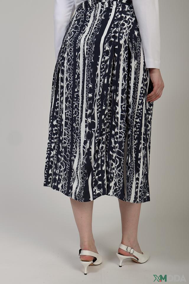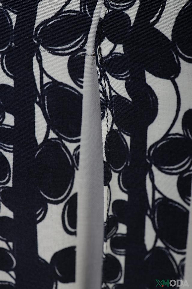 Юбка имеет выразительный чёрно-белый принт, состоящий из геометрических фигур и растительных элементов. Плиссированная фактура придает модели динамичный и элегантный вид. Высокая посадка подчеркивает талию и создает женственный силуэт.