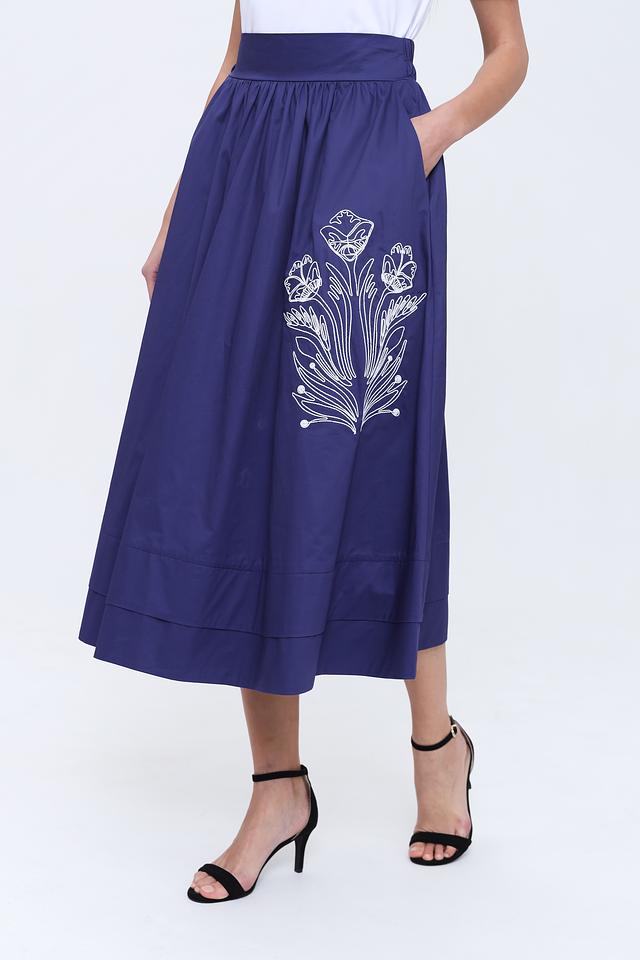 Особенностью данной юбки является изысканная вышивка в виде цветочного узора, выполненная белыми нитями. Вышивка расположена спереди на юбке, добавляя образу оригинальности и женственности.