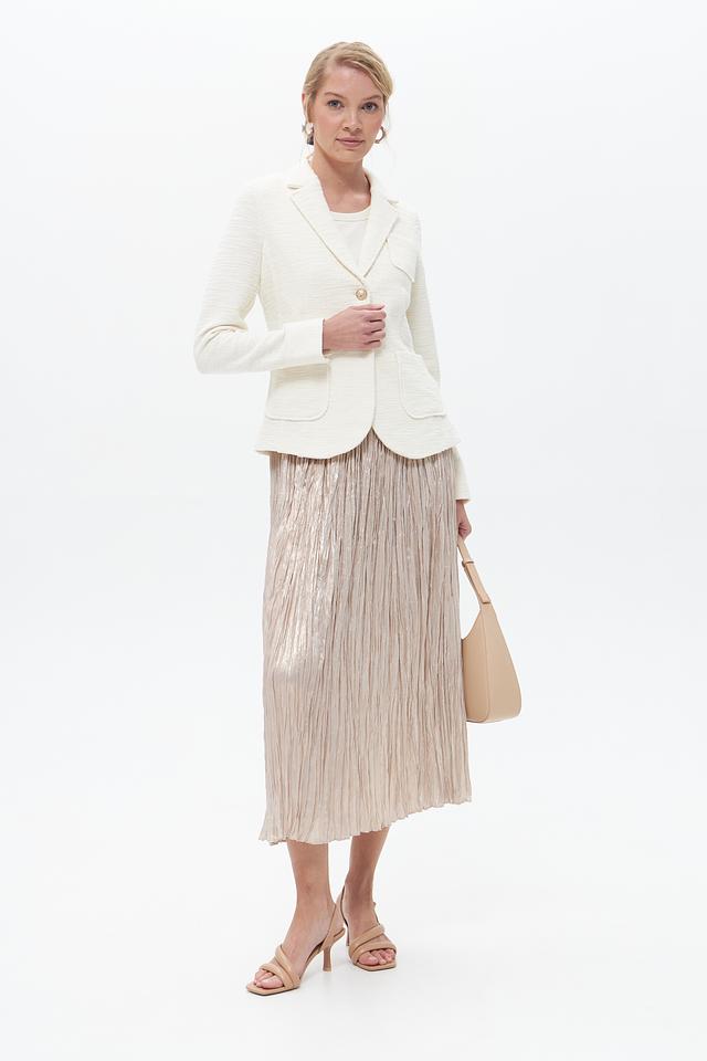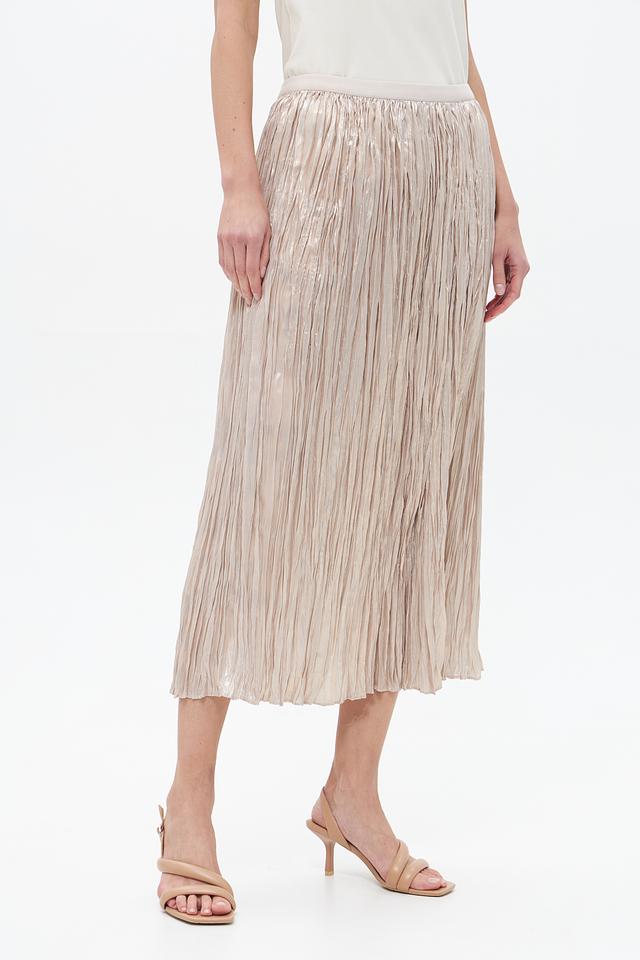 Юбка имеет длину миди и выполнена в золотистом цвете с эффектной плиссировкой. Плиссировка придает юбке динамичный вид и делает ее подходящей как для повседневной носки, так и для особых случаев.