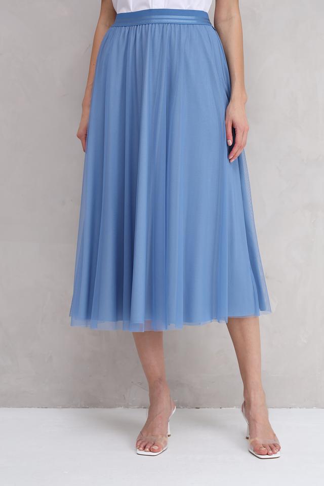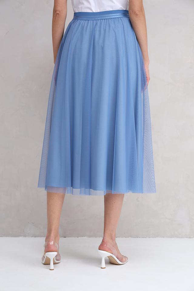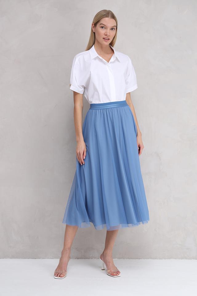 Юбка имеет длину миди и классический крой, который подходит для большинства типов фигур. Голубой цвет юбки делает её универсальным элементом гардероба, который легко сочетается с различными топами и обувью.