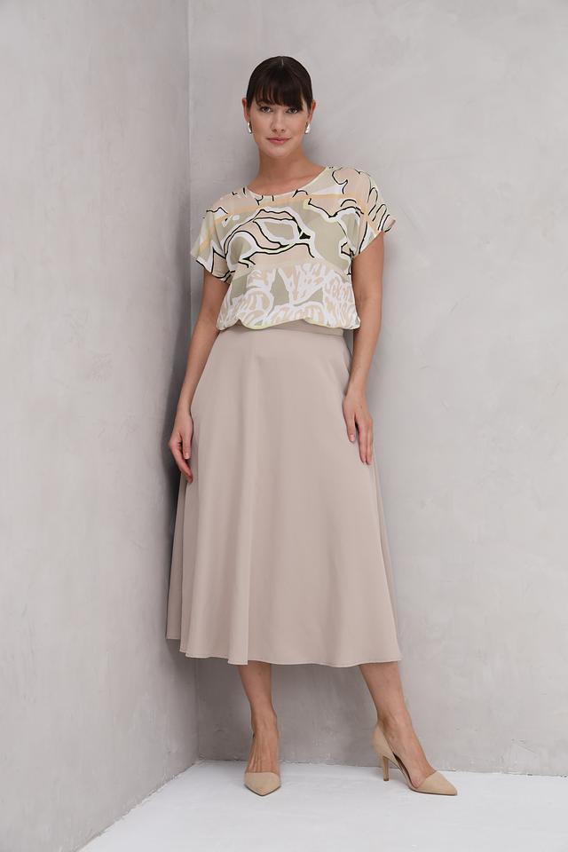 Юбка выполнена из смесовой ткани, состоящей из полиэстера, лиоцелла и льна. Это сочетание обеспечивает приятные тактильные ощущения, хорошую воздухопроницаемость и легкий уход.