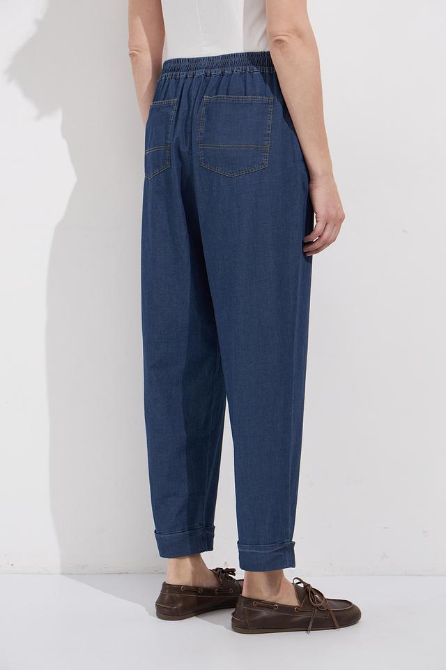 Женские брюки Zanetti синего цвета с декоративной вышивкой по бокам. Модель выполнена из хлопка с добавлением эластана для комфорта и свободы движений, имеет удобный пояс на завязках. Состав: хлопок 98%, эластан 2%