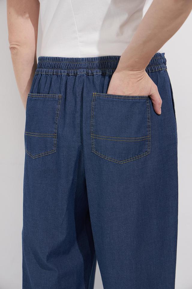 Брюки имеют классический синий цвет и свободный крой, который подчеркивает непринужденный стиль. Оригинальным акцентом является декоративная вышивка по боковым швам, выполненная в ярких цветах, что придает брюкам индивидуальность.