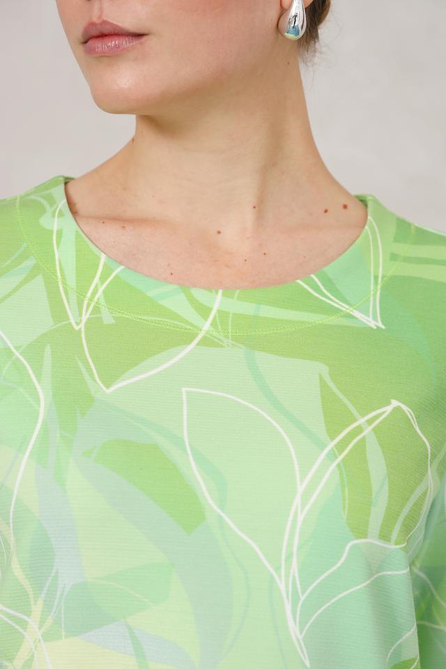 Пуловер имеет свободный крой и короткие рукава, что делает его идеальным для теплой погоды. Его основной цвет – лайм, украшенный ярким и необычным принтом в виде листьев. Такой рисунок добавляет образу свежести и оригинальности.