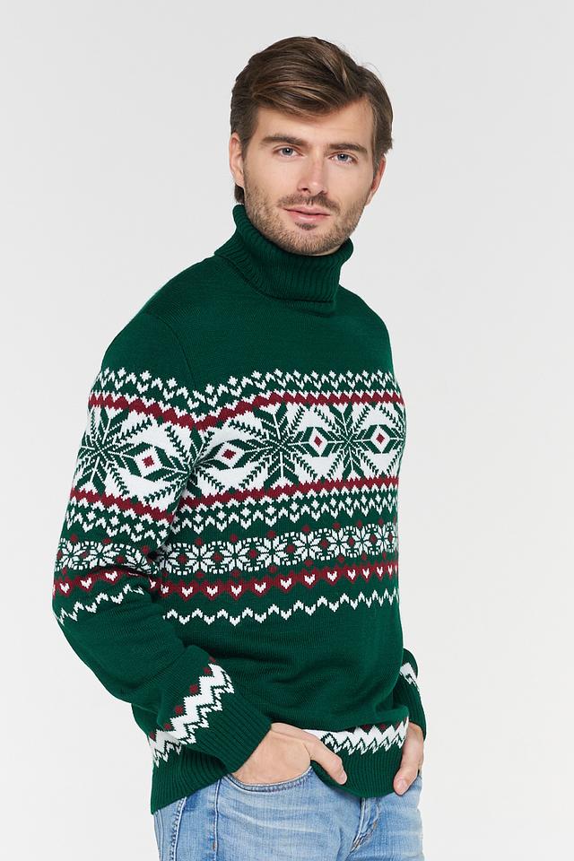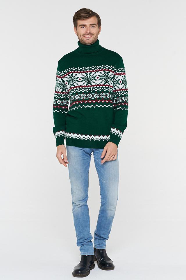 Основной цвет пуловера – насыщенный зелёный, который гармонично сочетается с ярким жаккардовым узором, выполненным в белых, красных и бежевых тонах. Узор представляет собой традиционный геометрический орнамент, придающий изделию особый шарм.