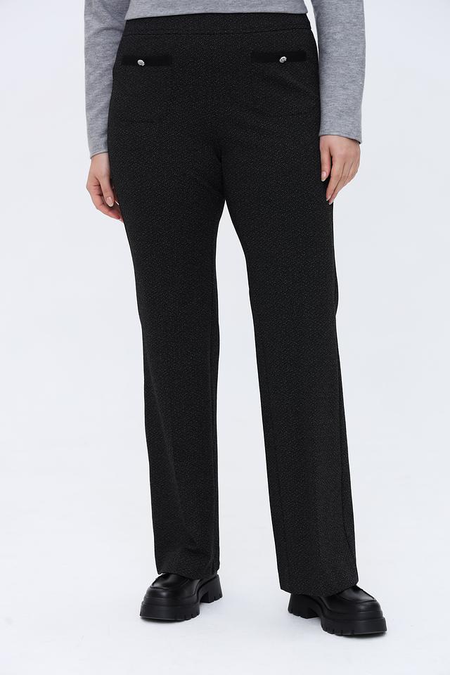 Брюки имеют прямой крой и пояс на резинке, что обеспечивает удобную посадку по фигуре. Декоративные элементы в виде небольших страз на карманах придают брюкам изысканность и индивидуальность.