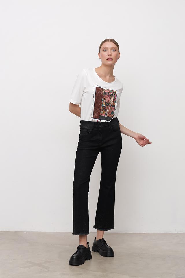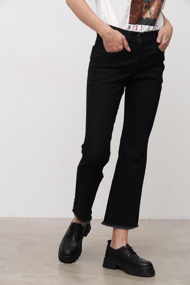 Материал джинсов – это сочетание хлопка, полиэстера, луоселла и эластана. Хлопок обеспечивает мягкость и комфорт, полиэстер – износостойкость, луоселл – приятные тактильные ощущения, а эластан – эластичность и свободу движений. Джинсы имеют необработанный край по низу, что придает им современный и слегка небрежный вид.