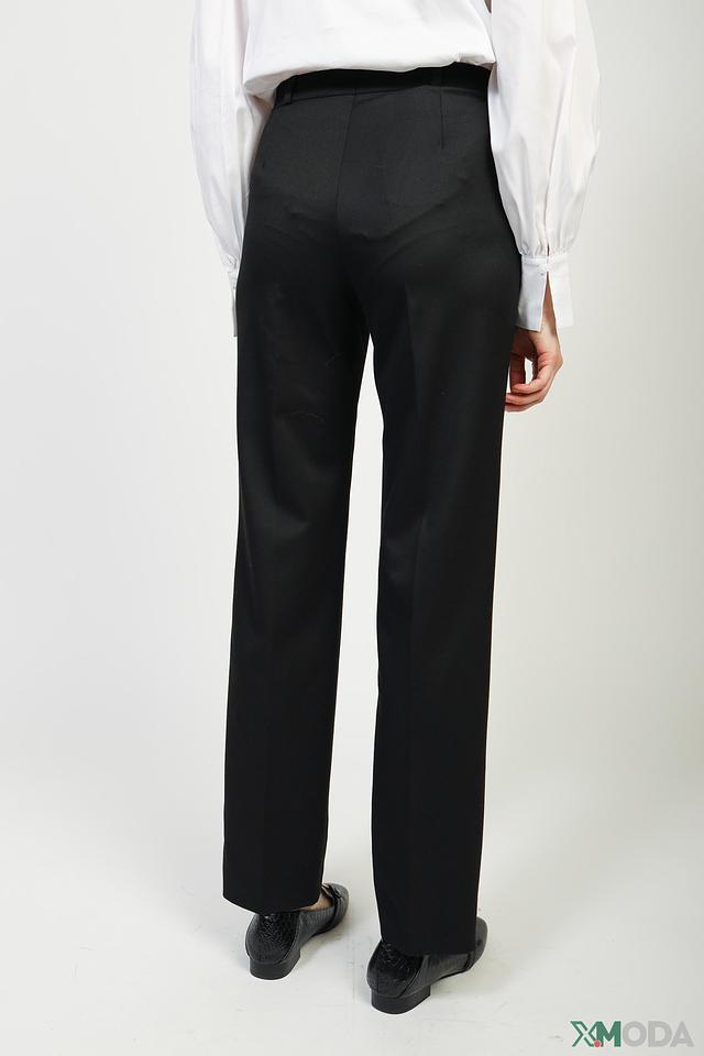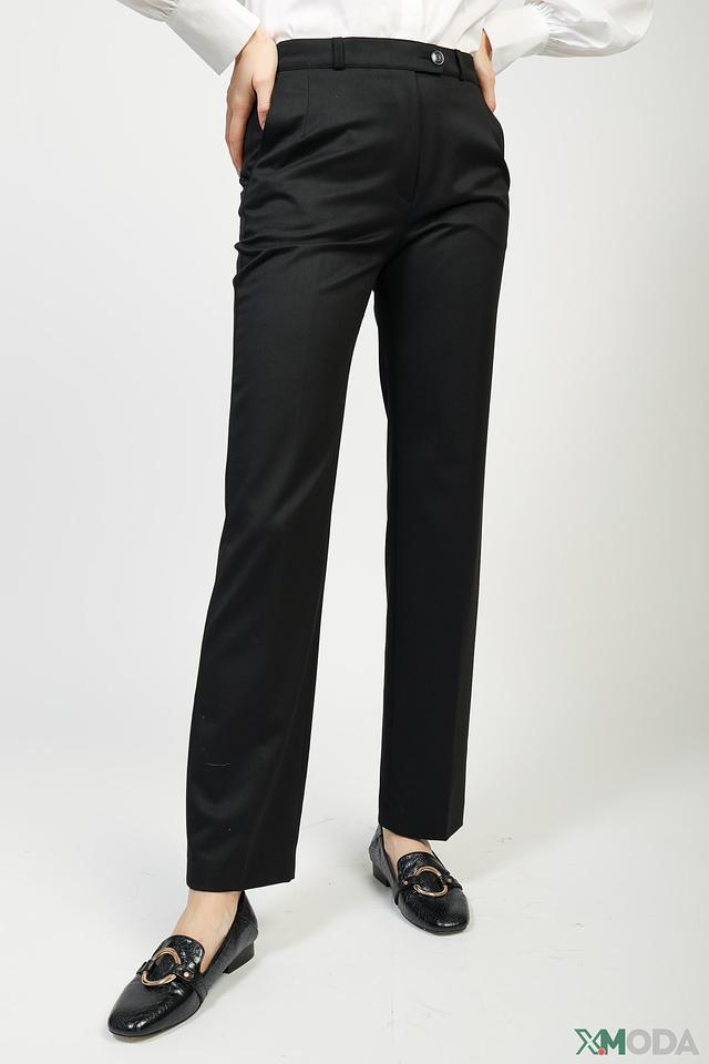 Брюки имеют прямой крой, который обеспечивает свободу движений и комфортную посадку по фигуре. Высокая посадка визуально удлиняет ноги и подчеркивает талию. Застежка на молнию и пуговицу обеспечивает надежную фиксацию. Модель дополнена боковыми карманами.