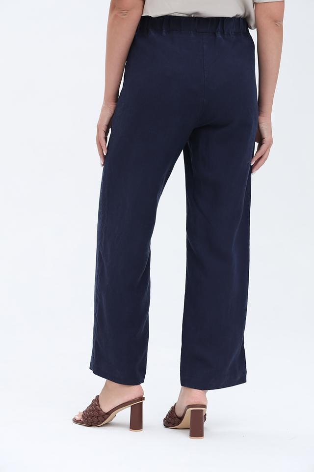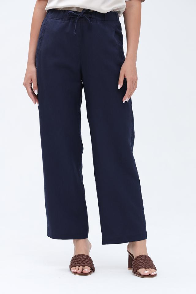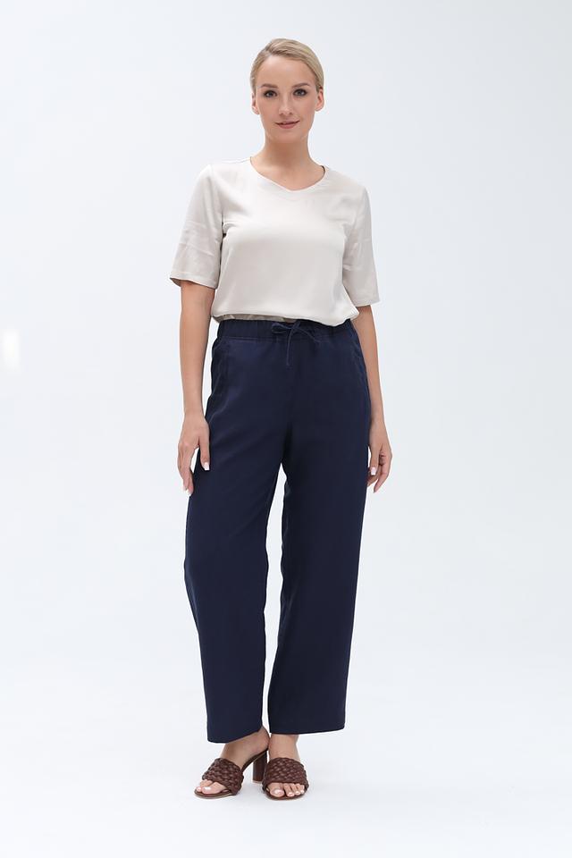 Брюки имеют прямой крой и зауженный книзу силуэт, что делает их универсальными для разных типов фигур. Эластичный пояс с завязками обеспечивает комфортную посадку и позволяет регулировать облегание.