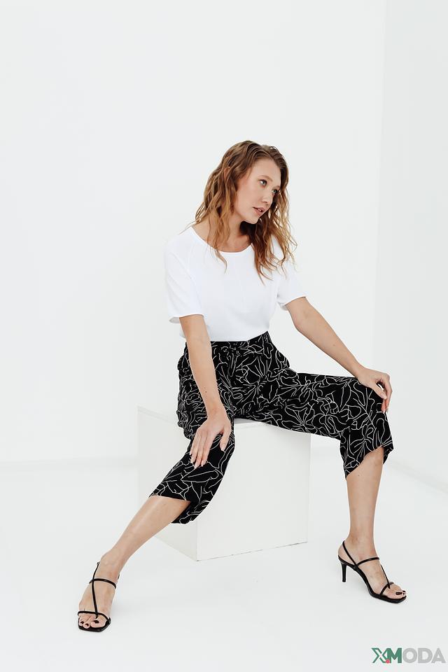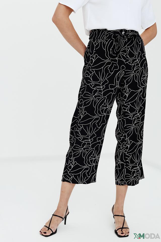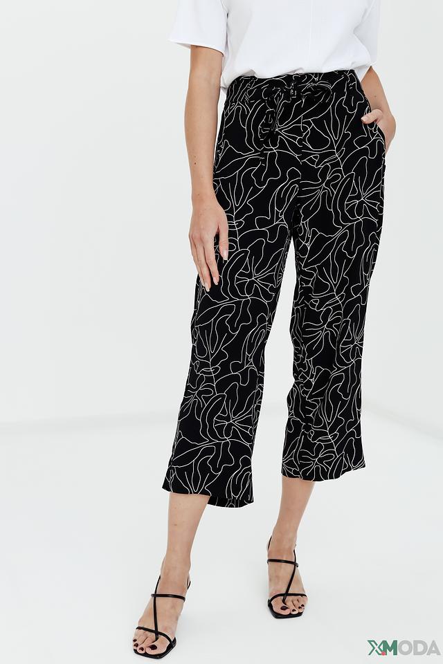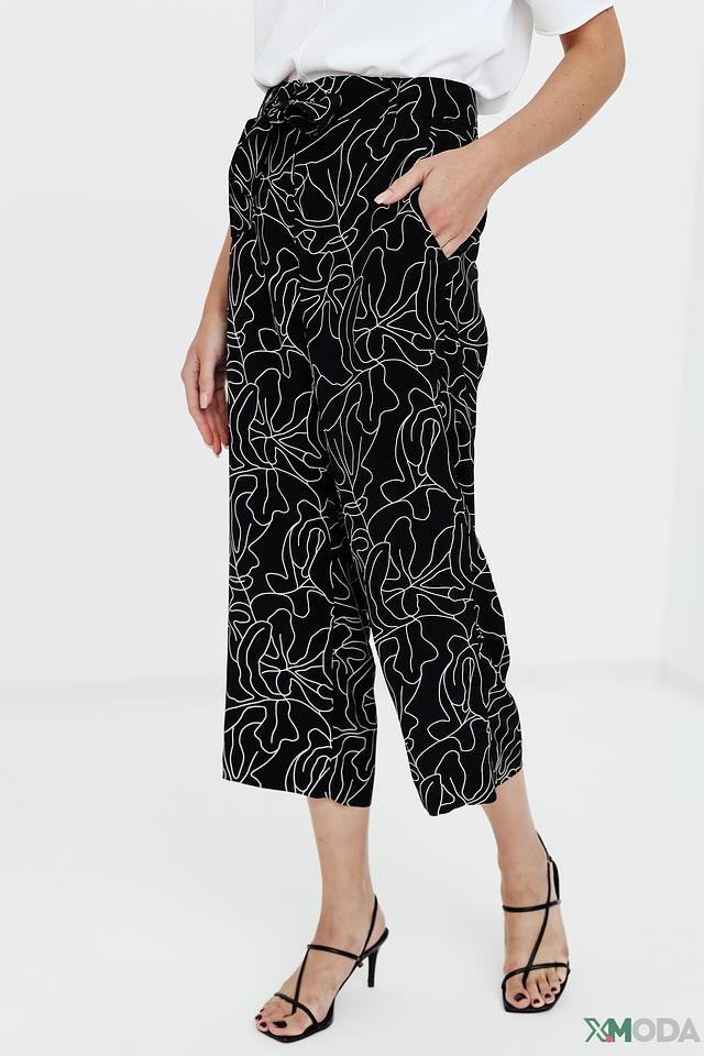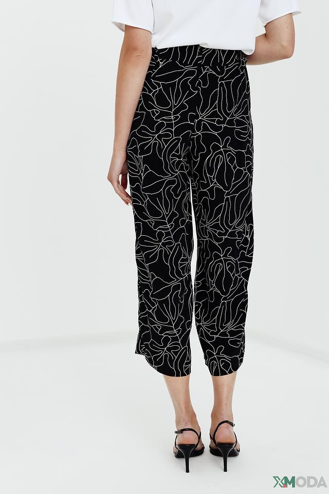 Брюки имеют классический чёрный цвет, украшенный ярким и необычным растительным принтом. Завышенная талия и пояс с завязками подчеркивают фигуру и позволяют регулировать посадку.