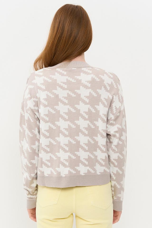Кардиган имеет укороченный крой и застегивается на пуговицы по всей длине. Особенность модели – актуальный геометрический рисунок в клетку, выполненный в бежевых и белых тонах. Вязаная текстура добавляет изделию уют и объём.