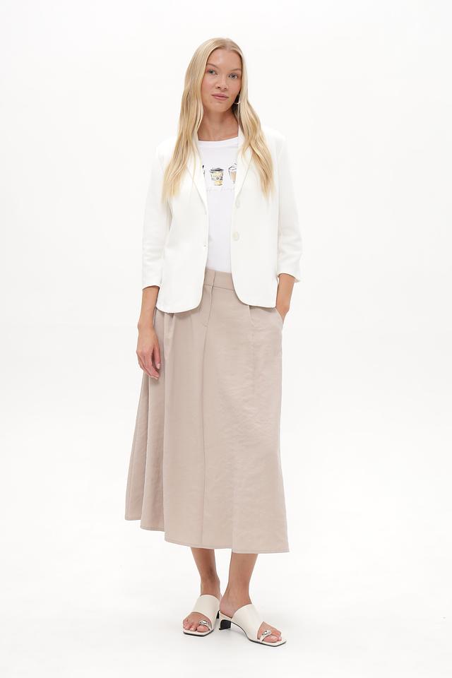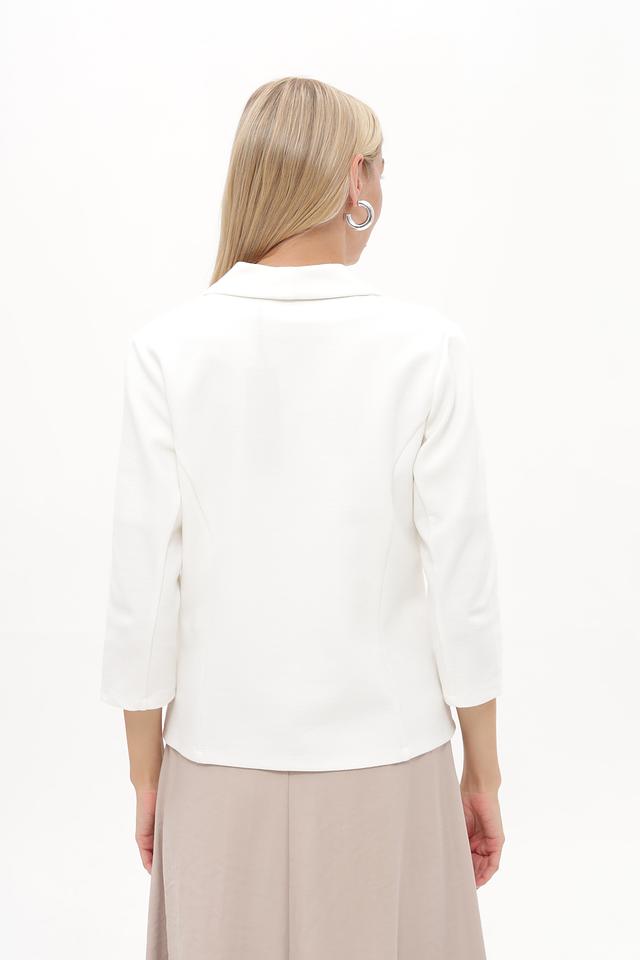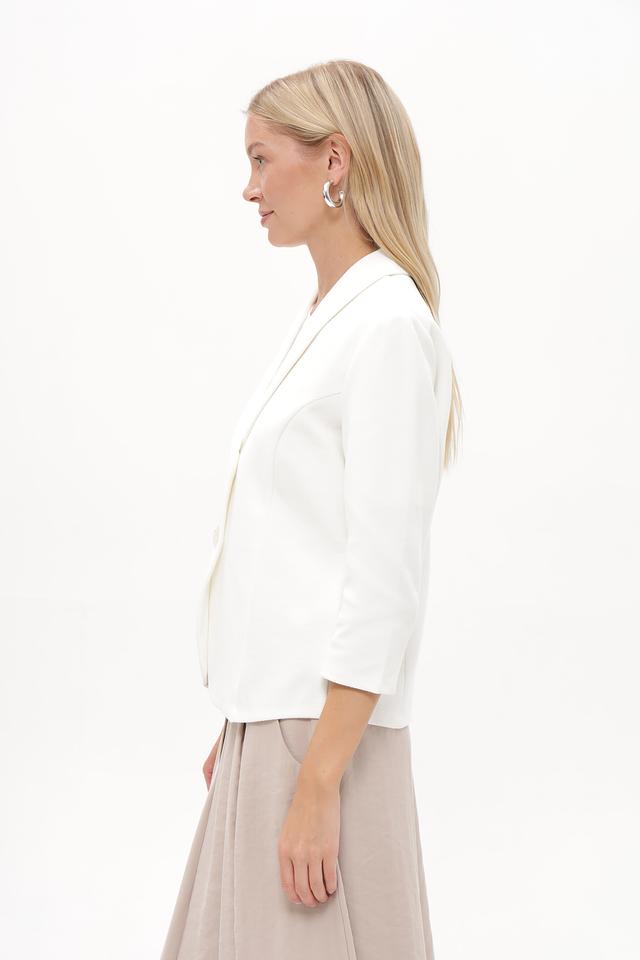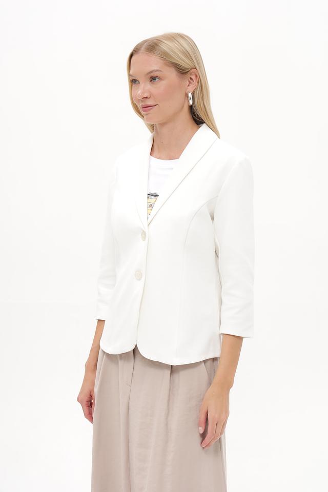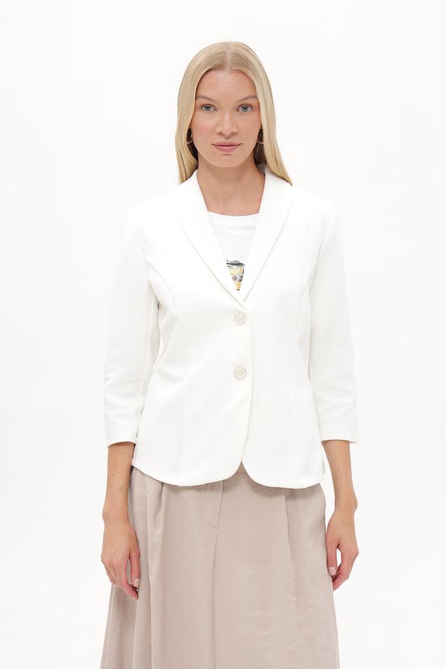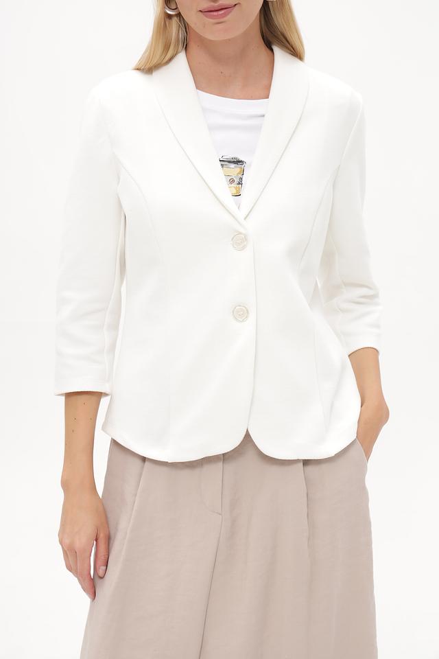 Жакет застегивается на три пуговицы в тон ткани, что позволяет регулировать степень прилегания. Рукава ¾ делают его идеальным для теплой погоды или для создания многослойных образов. Состав ткани включает хлопок, полиэстер и эластан, что обеспечивает комфорт в носке, хорошую посадку и устойчивость к сминанию.