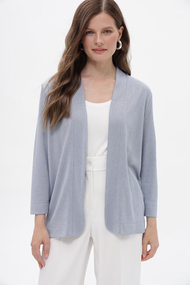 Жакет Bianca голубого цвета с добавлением металлизированной нити станет стильным дополнением к вашему гардеробу. Модель имеет свободный крой и короткий рукав 3/4, что делает ее универсальной для создания различных образов. Состав: вискоза 82%, метализ.нить 18%