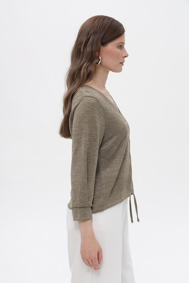 Жакет имеет V-образный вырез и застегивается на три пуговицы. Рукава длиной 3/4 добавляют образу легкости и непринужденности. Боковые завязки позволяют регулировать силуэт и подчеркнуть талию.