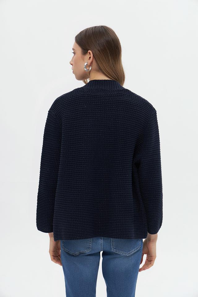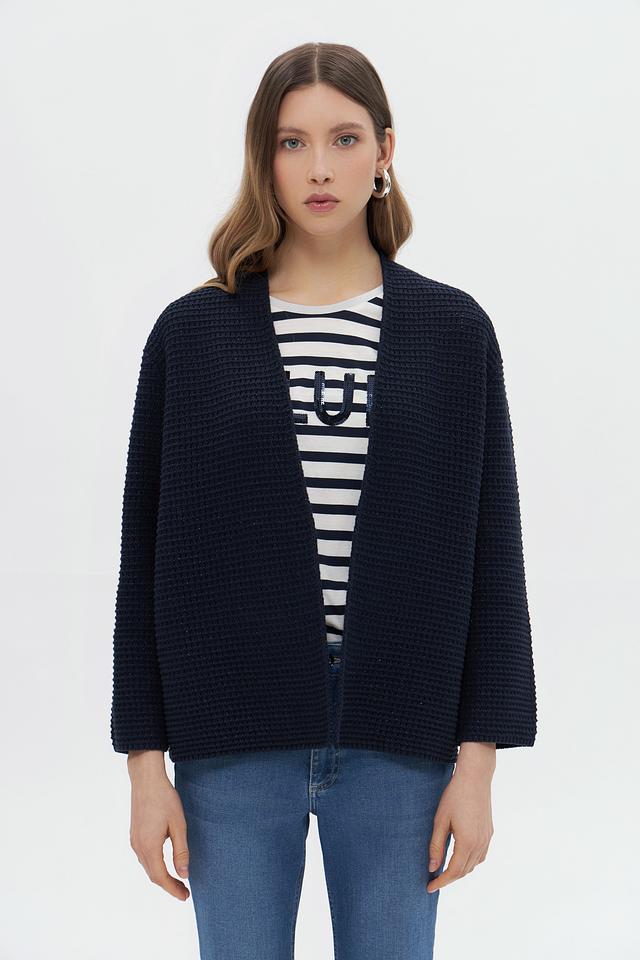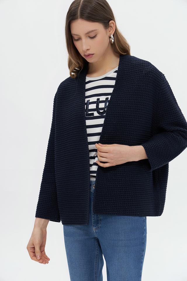 Тёмно-синий вязаный жакет от Bianca – стильное и комфортное решение для создания повседневных образов. Модель имеет свободный крой и текстурную вязку, что придает ей особый шарм. Состав: хлопок 55%, полиакрил 37%, метализ.нить 8%