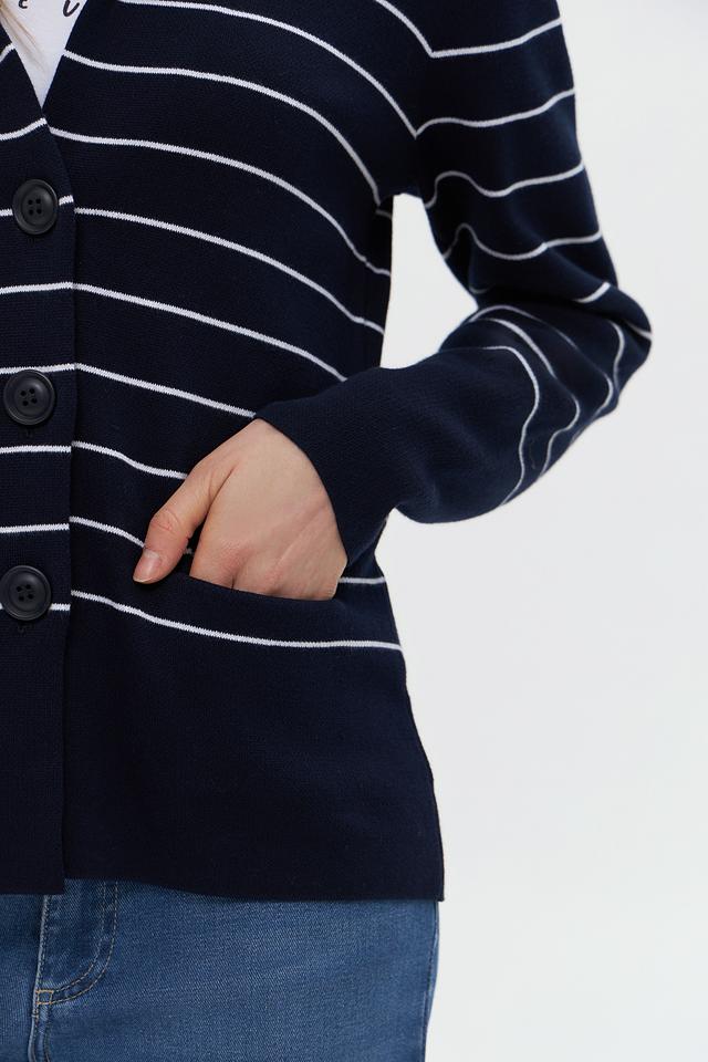 Жакет Bianca темно-синего цвета в белую полоску – стильное и комфортное решение для создания повседневных образов. Изготовлен из хлопка с добавлением модала и полиамида, что обеспечивает приятные тактильные ощущения и удобство в носке. Состав: хлопок 50%, модал 40%, полиамид 10%